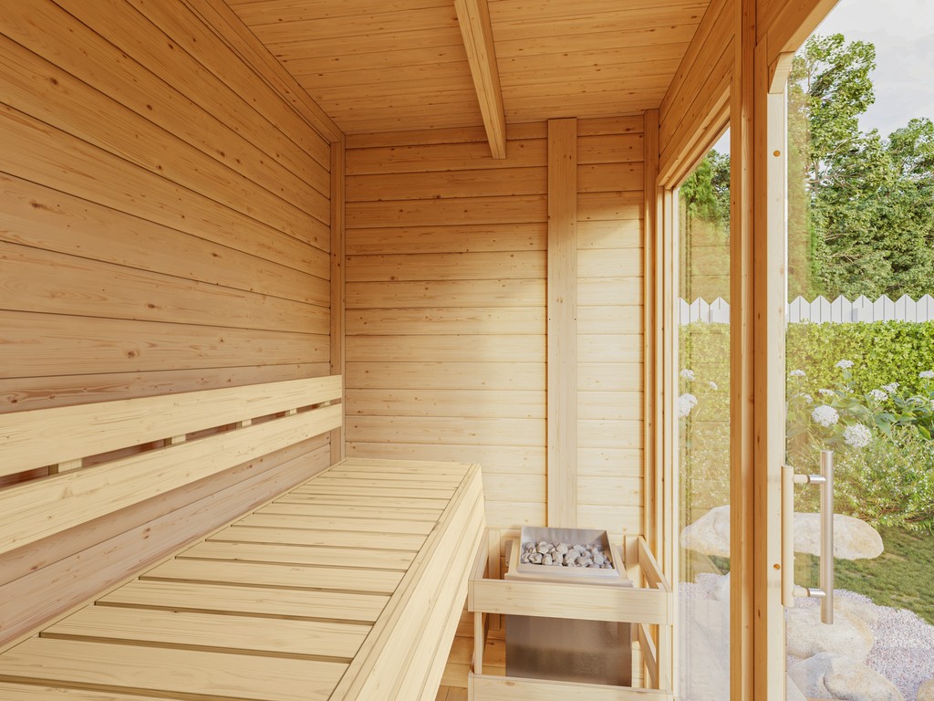 - Bodenrost aus fußwarmem Fichtenholz: für angenehmes Auftreten innerhalb und außerhalb der Sauna.