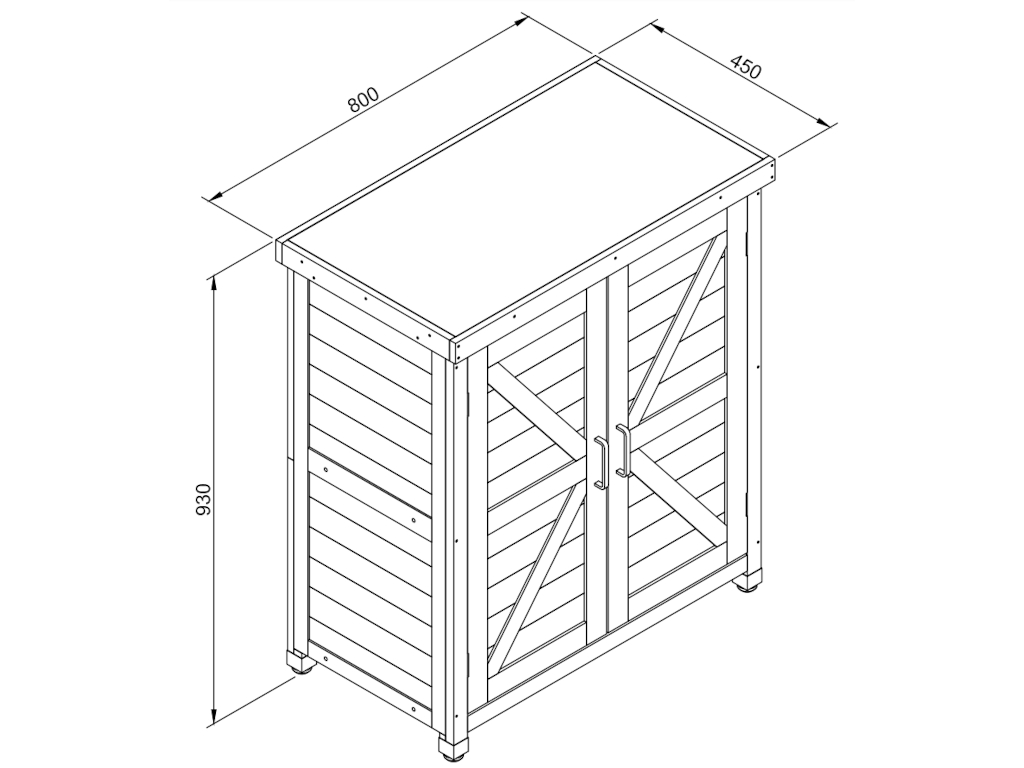 Die detaillierte und leicht verständliche Anleitung ermöglicht eine schnelle Montage. Die Füße des Gartenschranks sind mit Kunststoffkappen und einer justierbaren Schraubabdeckung ausgestattet, um kleine Bodenunebenheiten auszugleichen.
