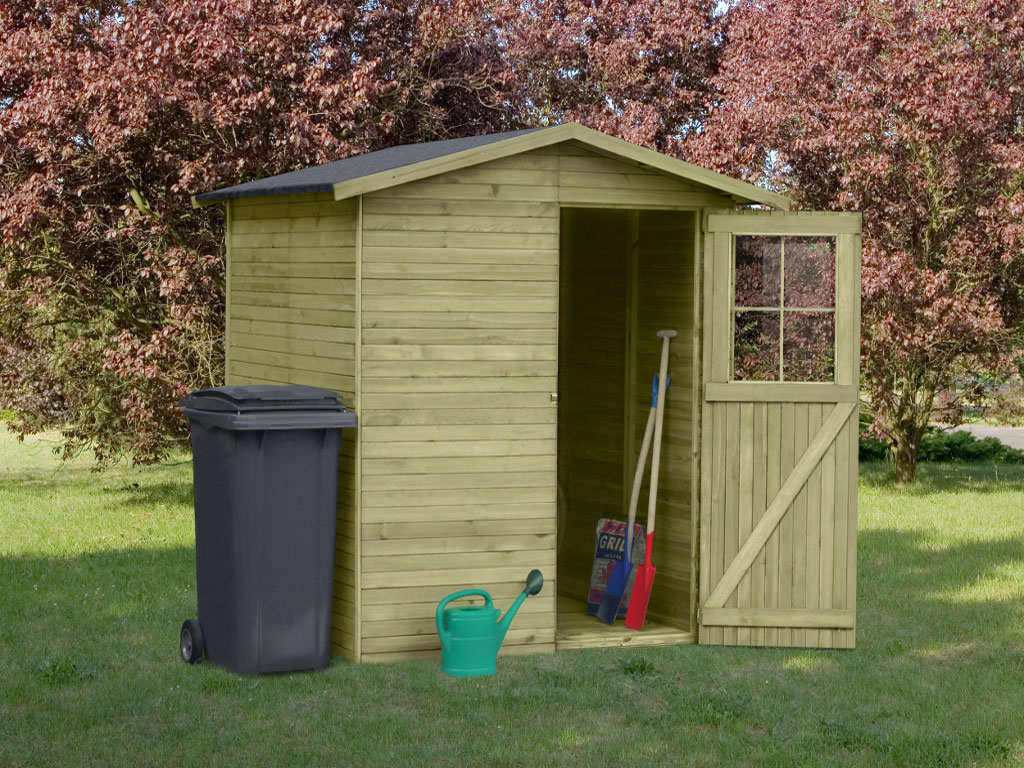 Die Einzeltür (B 71 x H 175,5 cm) mit Fenster aus Kunststoff, bietet Ihnen genug Freiraum, um auch sperrige Gegenstände unterzustellen. - Inkl. Boden und Dachpappe