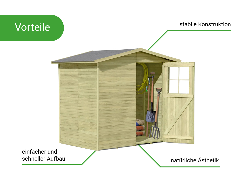 Die Grundfläche des Gartenhauses beträgt 3,24 m². Eine optimale Raumnutzung wird dank einer Firsthöhe von 210 cm gewährt.