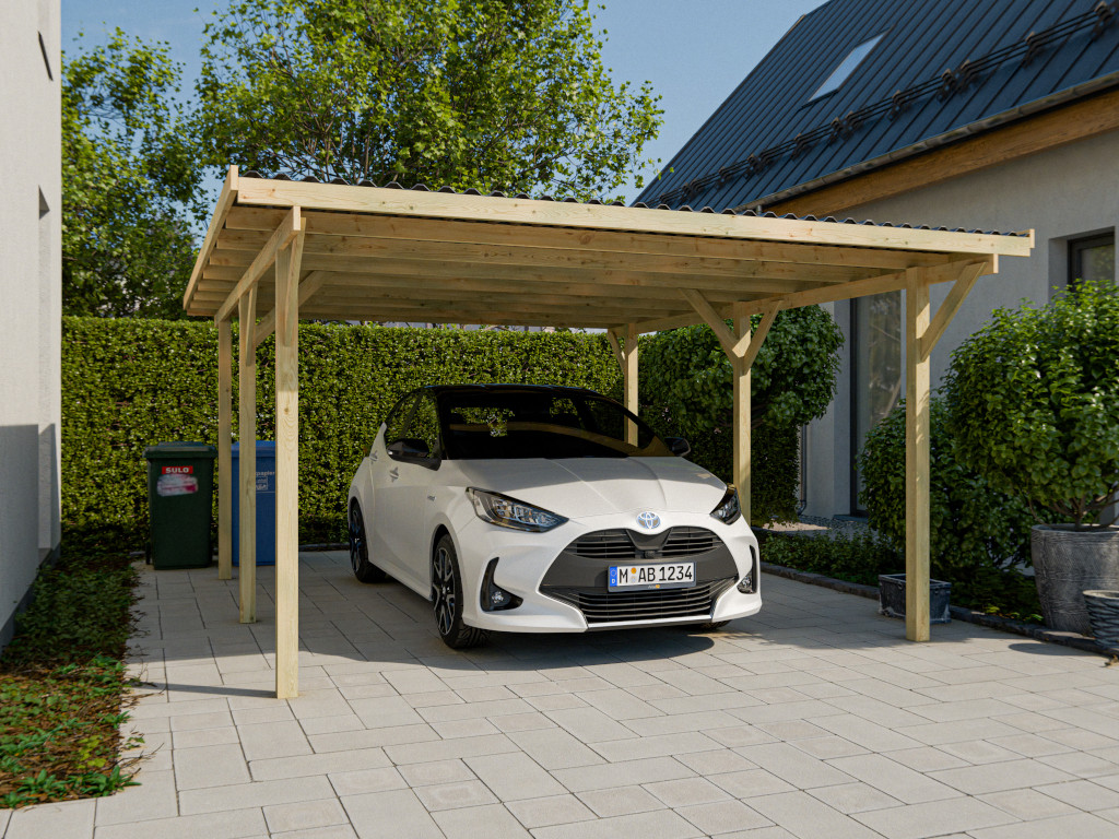 Ein Carport ist die ideale Lösung, um dein Auto vor der Witterung, Baumharz und Vogelkot zu schützen. Plus: Die offene Bauweise mit guter Luftzirkulation gewährleistet eine schnelle Trocknung bei Regen und Schnee und sorgt so für optimalen Korrosionsschutz. Mit einer Höhe von 226 cm und einem Sockelmaß von 387 x 428 cm (B x T) bietet dieser Carport ausreichend Platz für dein Fahrzeug und mehr.