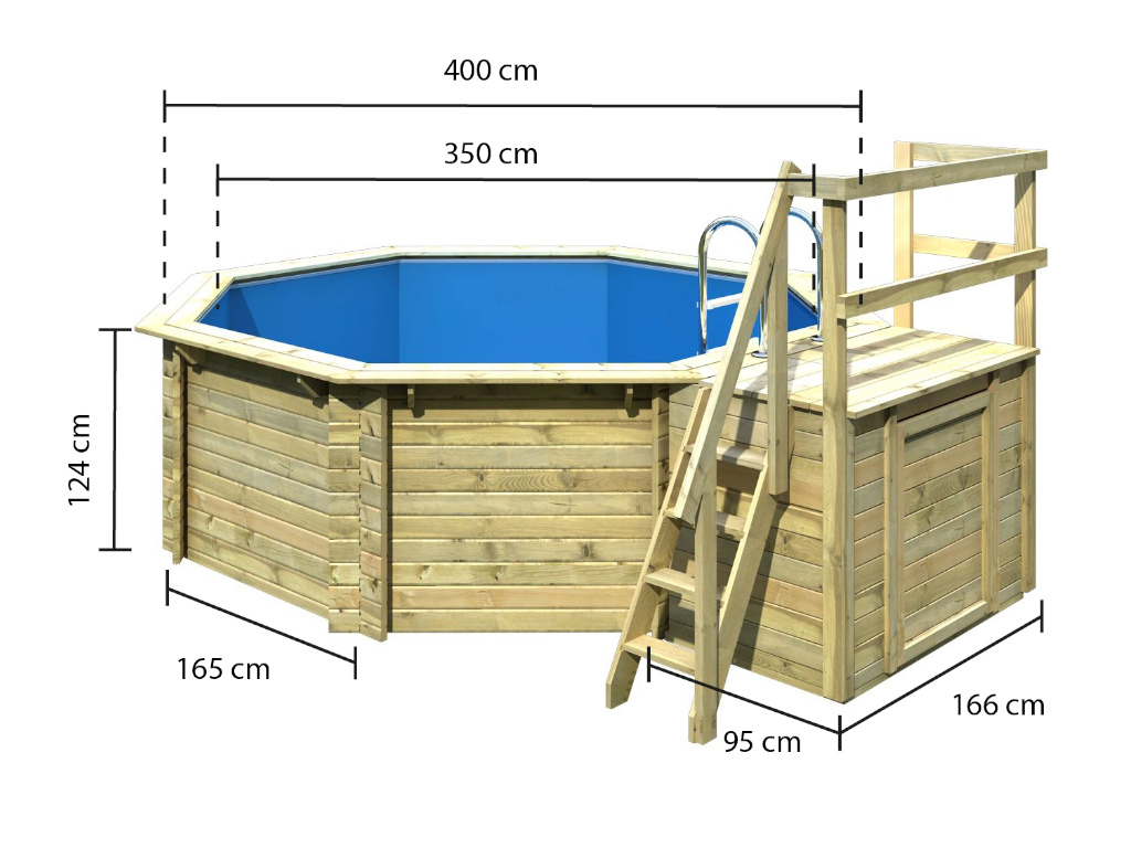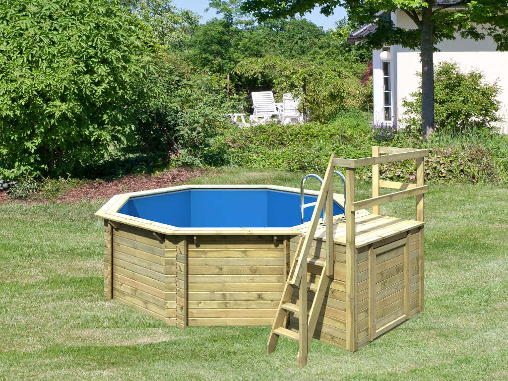 Dieser achteckige Pool fügt sich mit seiner hölzernen Beckenwand harmonisch ins natürliche Gesamtbild deines Gartens ein und macht dabei einen wertigen und soliden Eindruck.