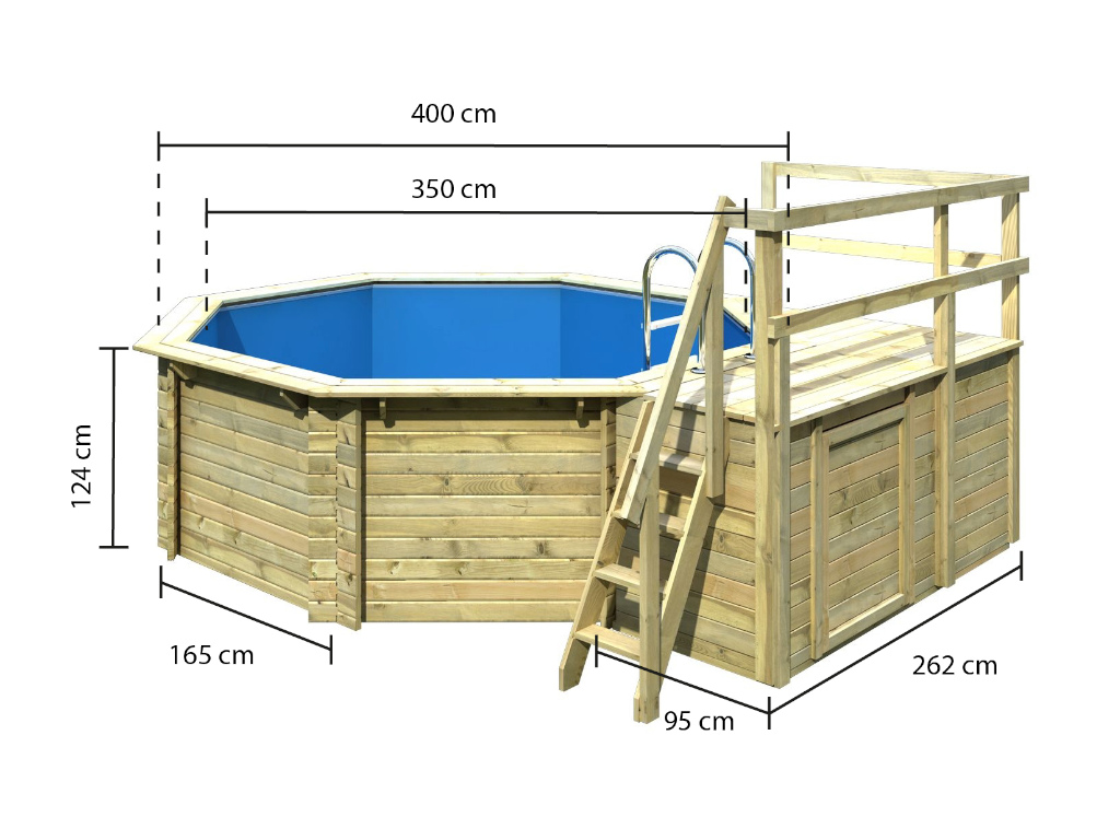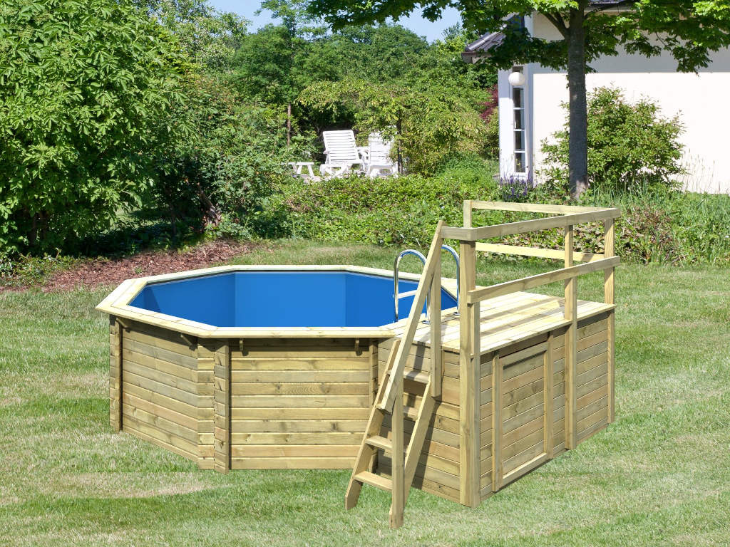 Dieser achteckige Pool fügt sich mit seiner hölzernen Beckenwand harmonisch ins natürliche Gesamtbild deines Gartens ein und macht dabei einen wertigen und soliden Eindruck.