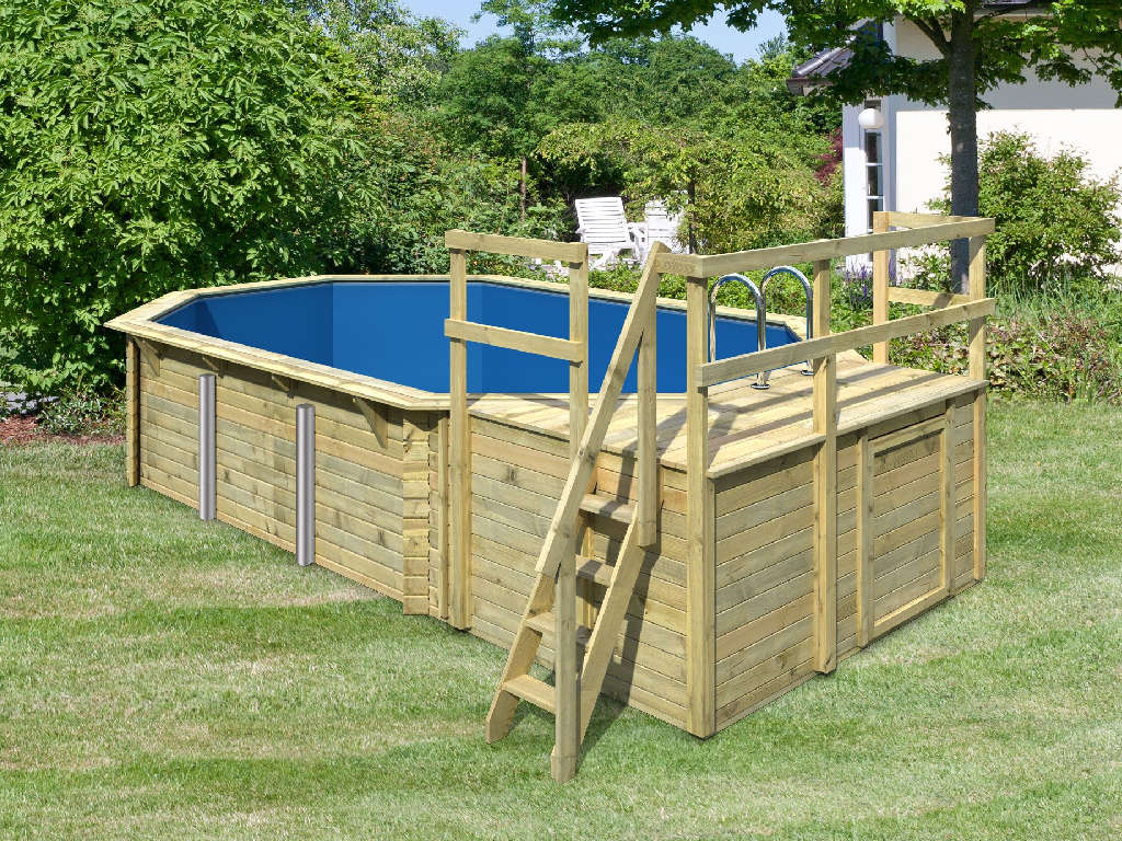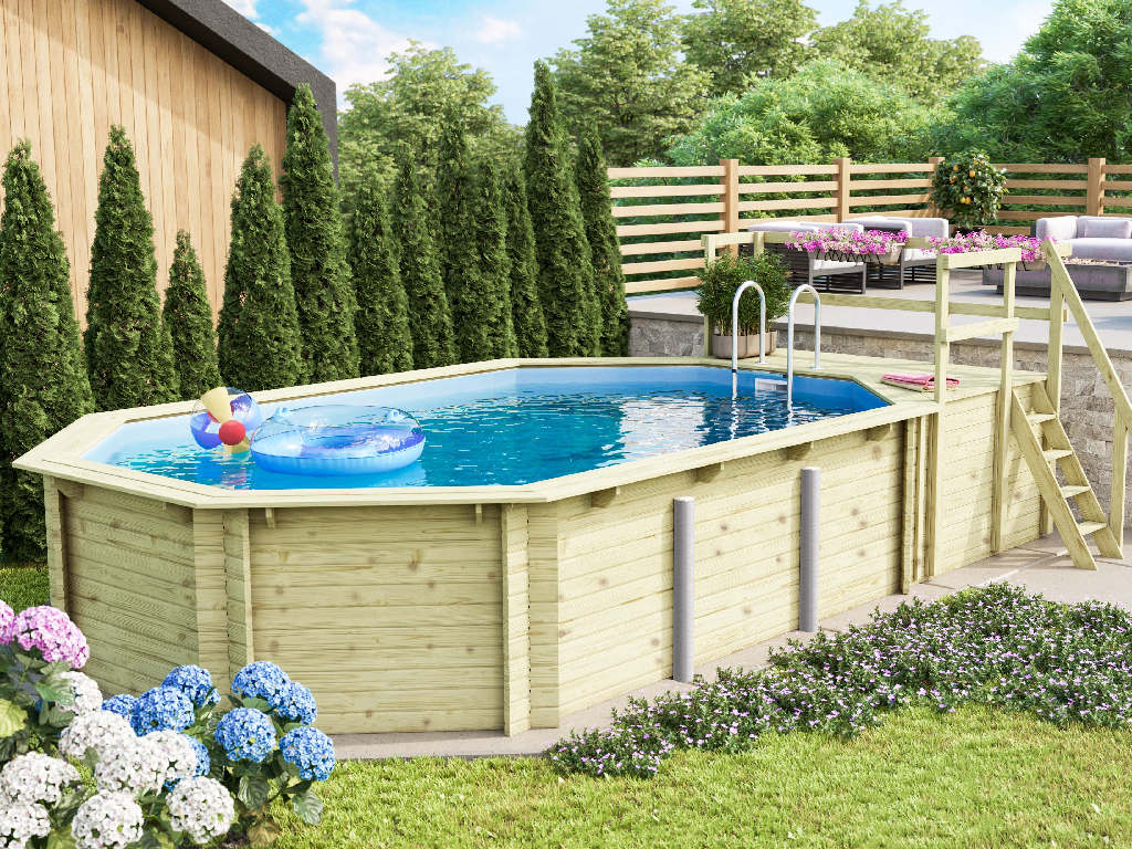 Dieser achteckige Pool fügt sich mit seiner hölzernen Beckenwand harmonisch ins natürliche Gesamtbild deines Gartens ein und macht dabei einen wertigen und soliden Eindruck.