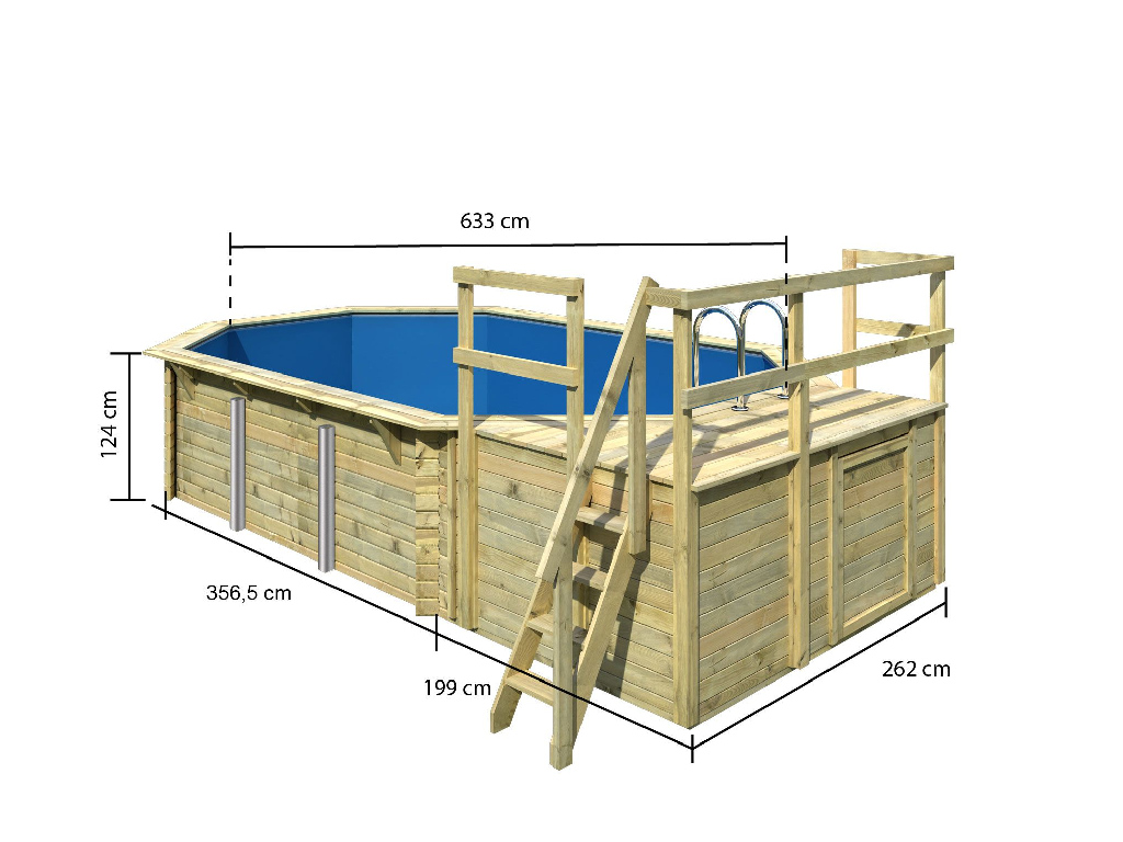 | Lieferumfang: | Holzpool, inkl. Leiter, Schutzvlies, Poolfolie, Unterlegvlies, Skimmer, Filteranlage |