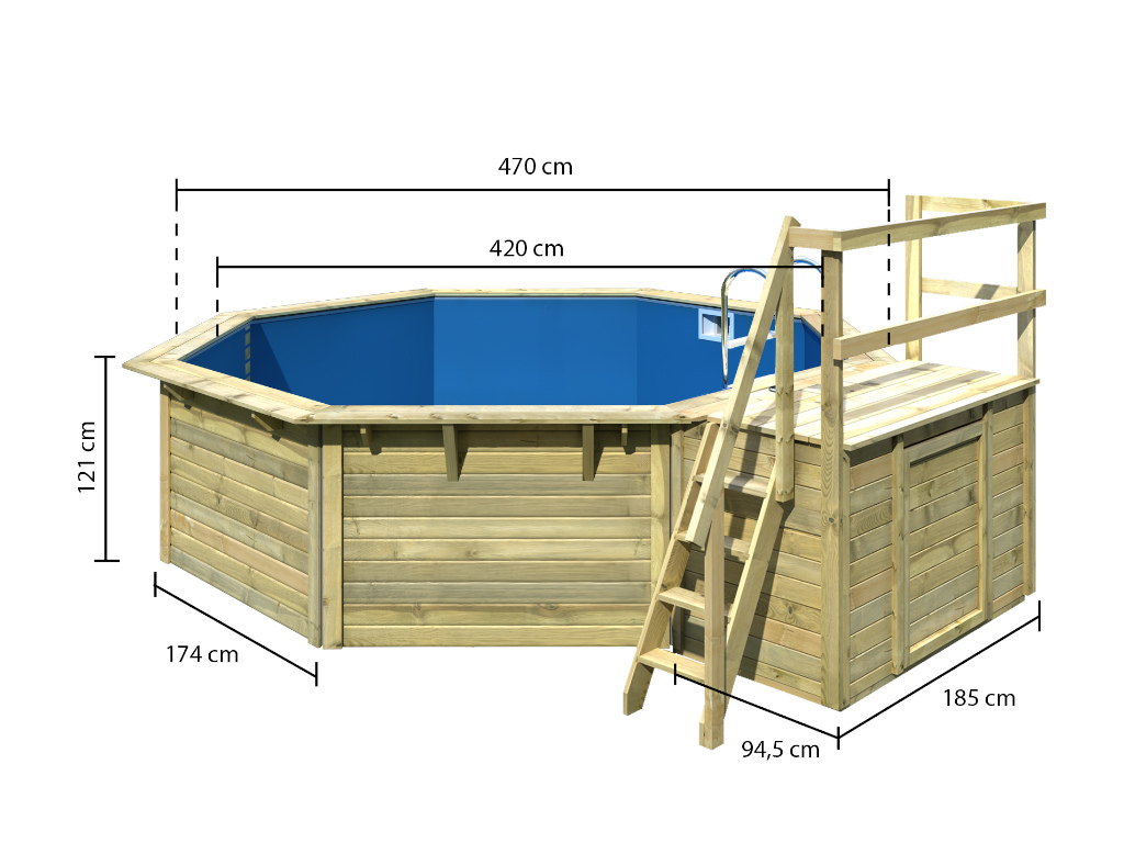 | Lieferumfang: | Holzpool, inkl. Leiter, Schutzvlies, Poolfolie, Unterlegvlies, Skimmer, Filteranlage |
