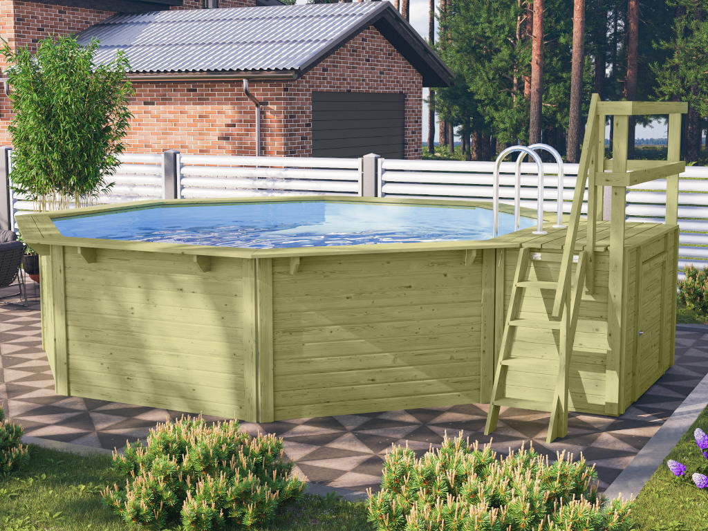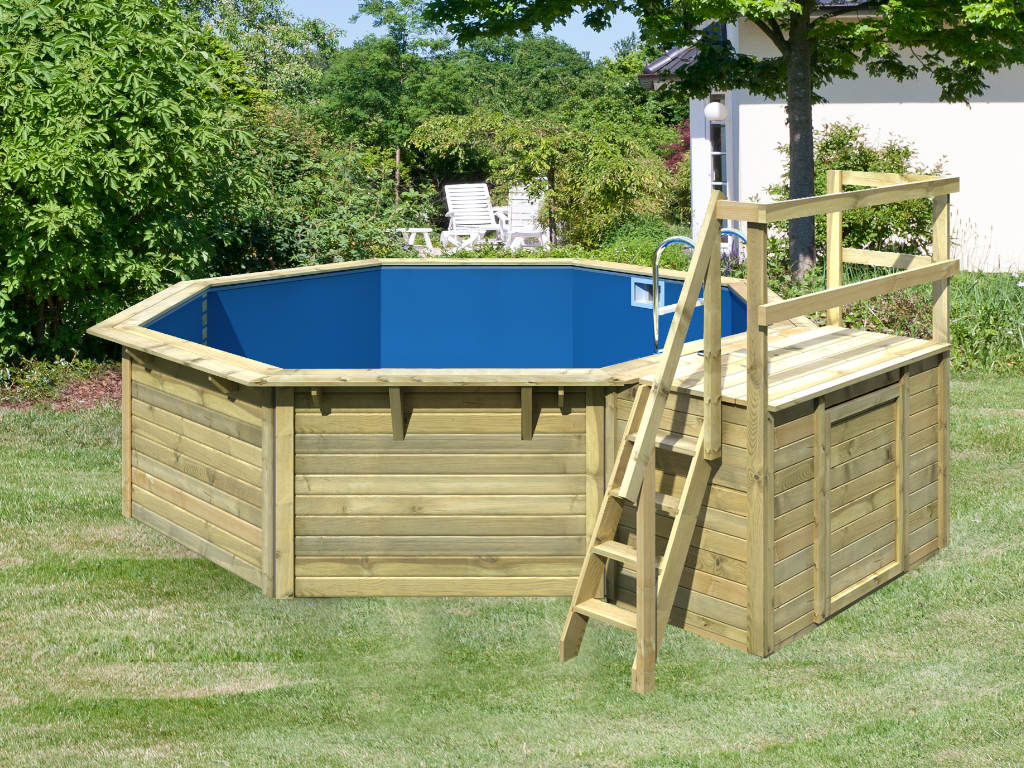 Dieser achteckige Pool fügt sich mit seiner hölzernen Beckenwand harmonisch ins natürliche Gesamtbild deines Gartens ein und macht dabei einen wertigen und soliden Eindruck.