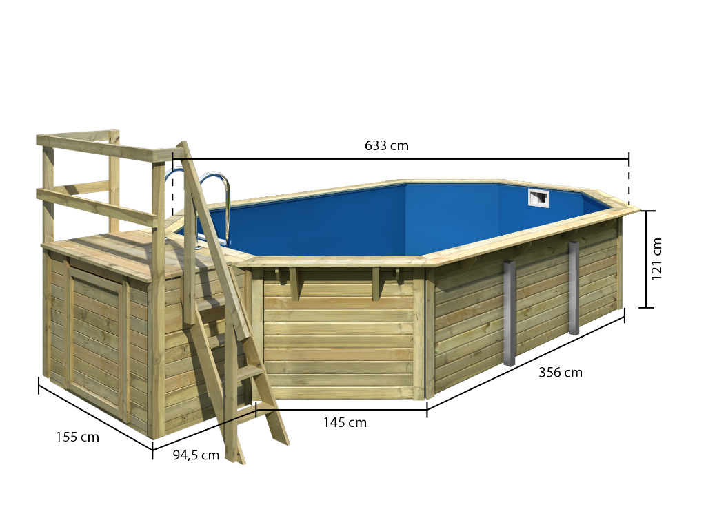| Lieferumfang: | Holzpool, inkl. Leiter, Schutzvlies, Poolfolie, Unterlegvlies, Skimmer, Filteranlage |