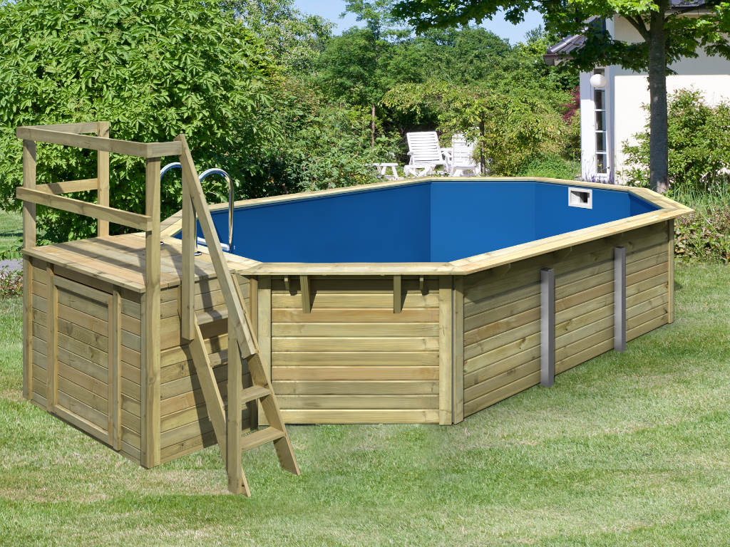 Dieser achteckige Pool fügt sich mit seiner hölzernen Beckenwand harmonisch ins natürliche Gesamtbild deines Gartens ein und macht dabei einen wertigen und soliden Eindruck.