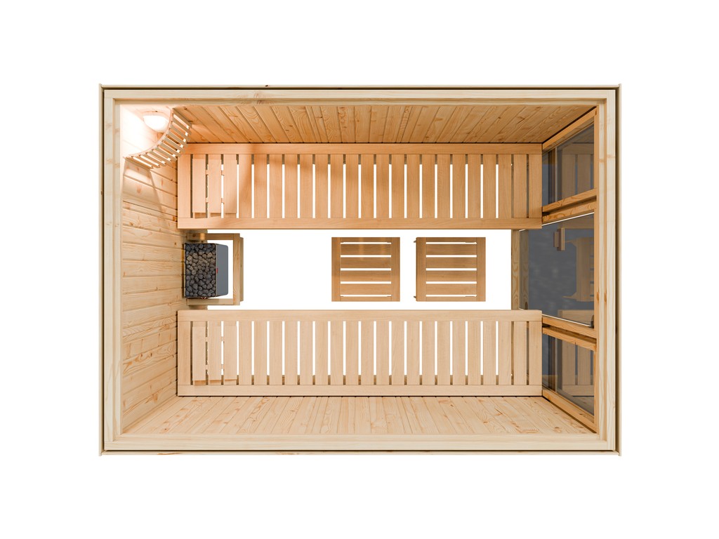 Lieferumfang: 2 Liegen, 2 Kopfstützen, 2 Hocker, Ofenschutz, Saunaleuchte, Bodenrost und inkl. 2 Front