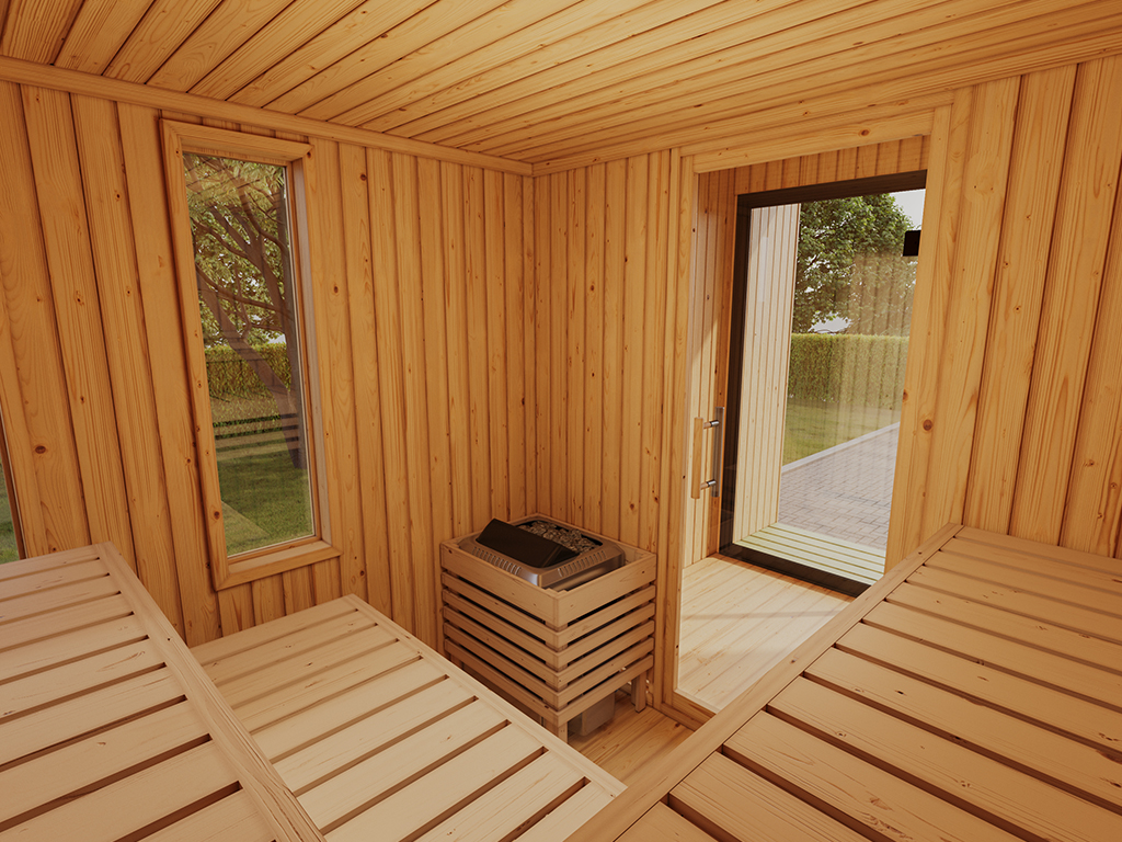 Die Maße dieser Sauna von B 288 x T 220 x H 244 cm erlauben es, dass 1-2 Personen gleichzeitig saunieren können. Mit 2 Liegen wird das Erlebnis für jeden Saunagast besonders angenehm. In der Grundausstattung sind 2 Liegebänke (Breite ca. 57 cm) enthalten.