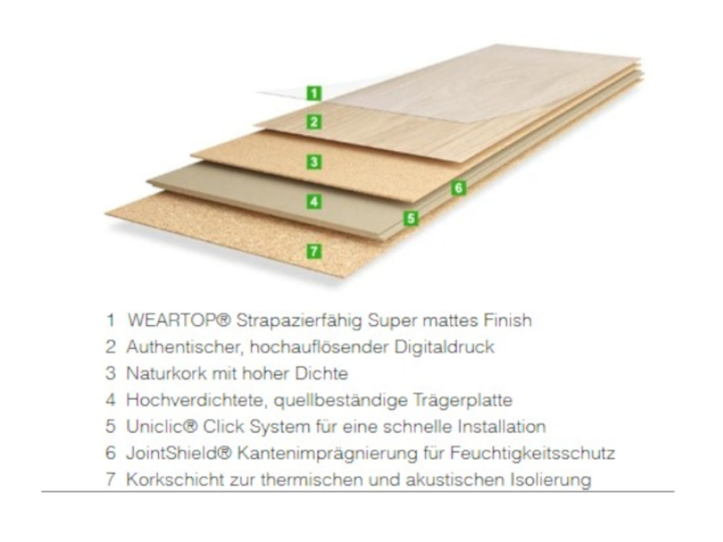 Die pflegeleichte, kratzfeste und unempfindliche Oberfläche kombiniert mit einer Mittelschicht aus hochdicht gepresstem und dennoch elastischem Kork erzeugt ein angenehmes Gehgefühl sowie besondere Langlebigkeit. Die unterste Schicht besteht aus einer quellreduzierten Holzfaserplatte (HDF), die für Stabilität und eine einfache Verlegung sorgt.