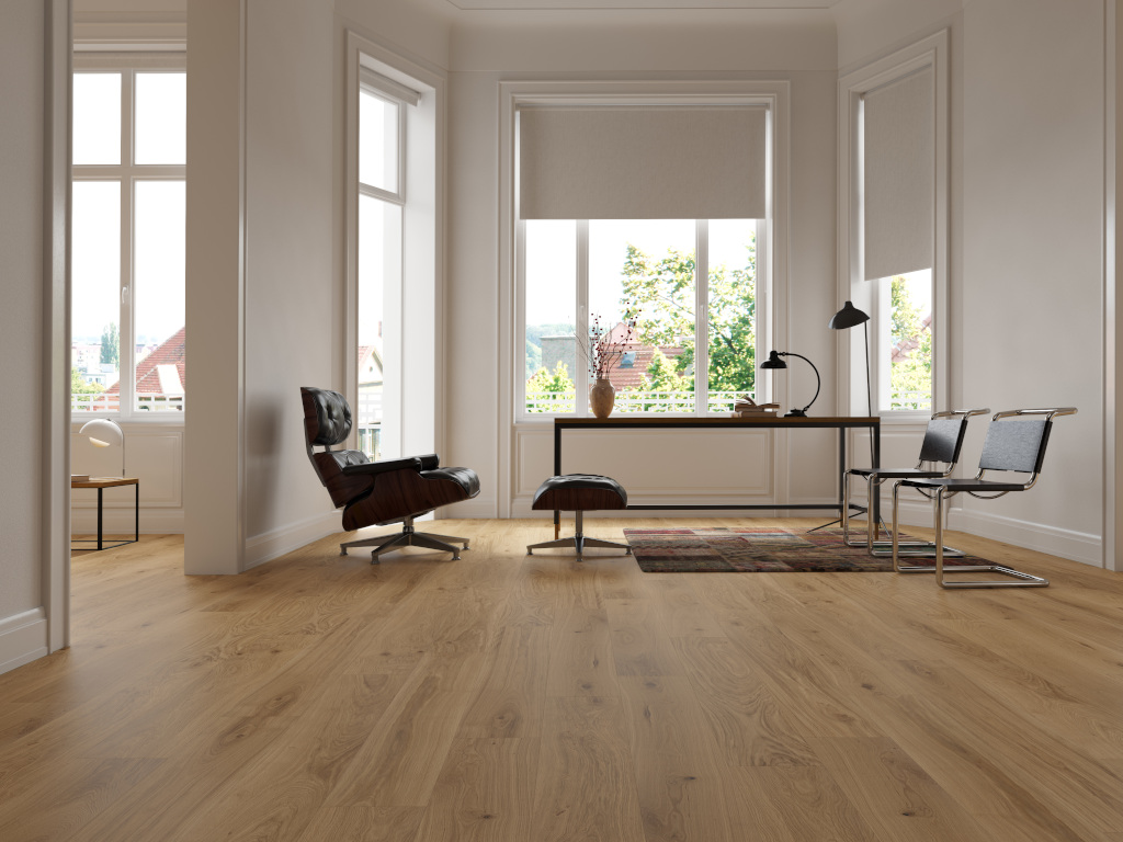 Das Dekor in authentischer Eichenholzoptik vermittelt fühlbare Wärme und Behaglichkeit. Die hochwertige Landhausdielenoptik dieses Korkbodens fügt sich optimal in jeden Einrichtungsstil ein. Das Ein-Stab-Design wirkt harmonisch und elegant. Die fugenlose Optik wirkt modern, raumöffnend sowie elegant und sorgt für ein nahtloses Verlegebild mit ebenmäßiger Raumwirkung.