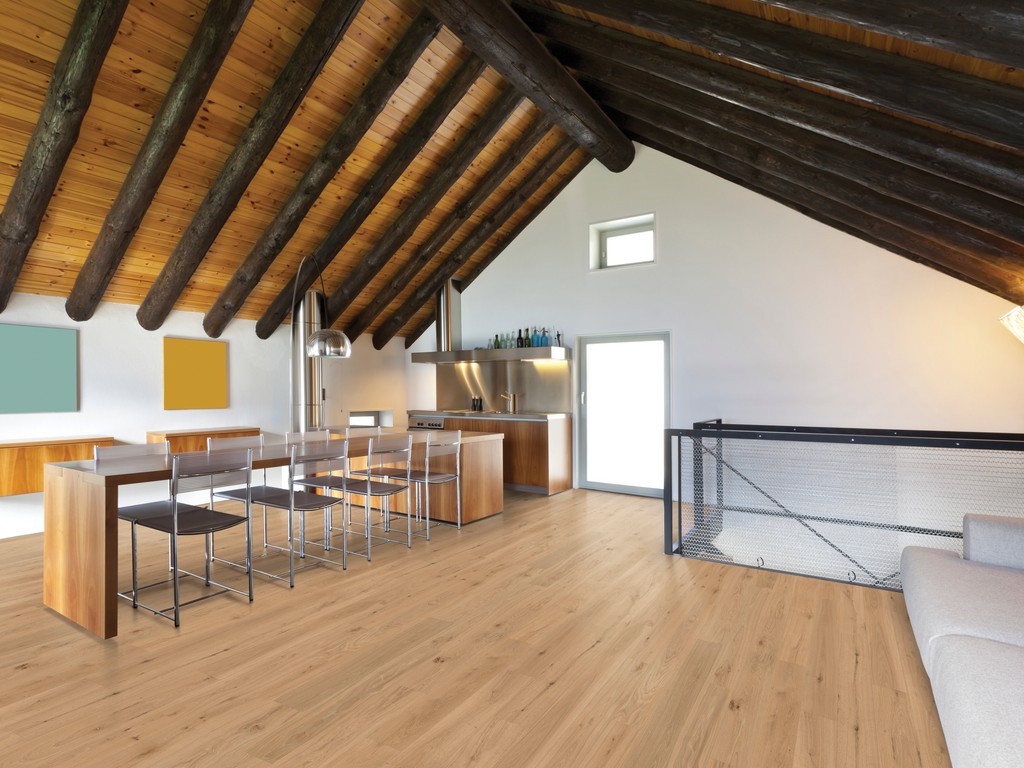 Dieser Artikel ist nicht feuchtraumgeeignet und sollte daher nicht in Küchen und Bädern verlegt werden. Der Boden ist unempfindlich gegenüber Temperaturschwankungen und hat eine hohe thermische Leitfähigkeit, weshalb er sich zur Verlegung über einer Warmwasserfußbodenheizung eignet. Da der Hohlraum zwischen Boden und Untergrund wie ein Resonanzkörper für Tritt- und Gehschall wirkt, ist die integrierte Dämmung eine Wohltat – nicht nur für die Nachbarn. Eine zusätzliche Unterlage ist nicht erforderlich und nicht zulässig.