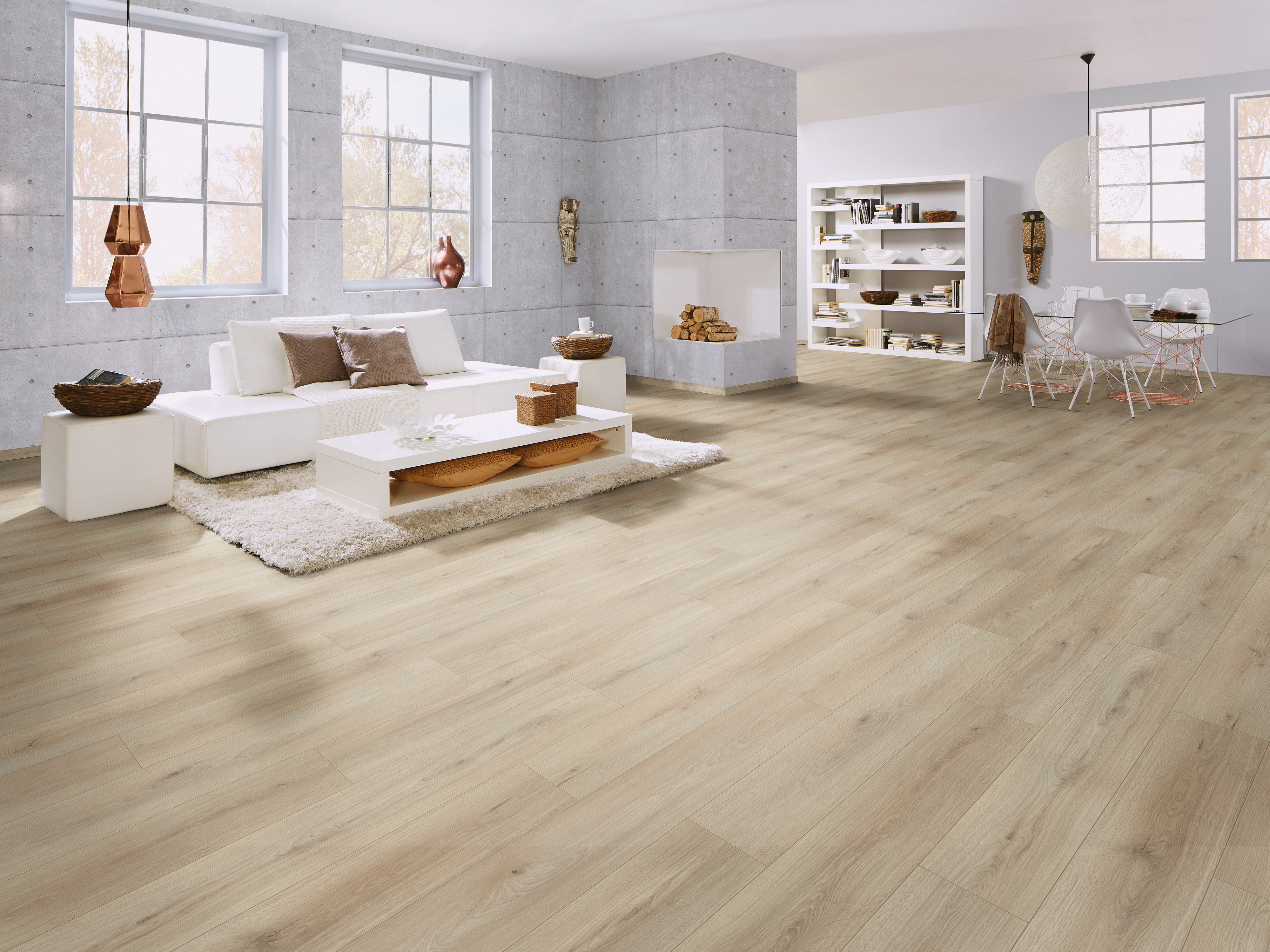 Laminat ist die ideale Kombination aus Design und Funktionalität. Die moderne Optik und die besonders pflegeleichte Oberfläche dieses Laminatbodens machen ihn zum perfekten Bodenbelag für fast jeden Bereich.