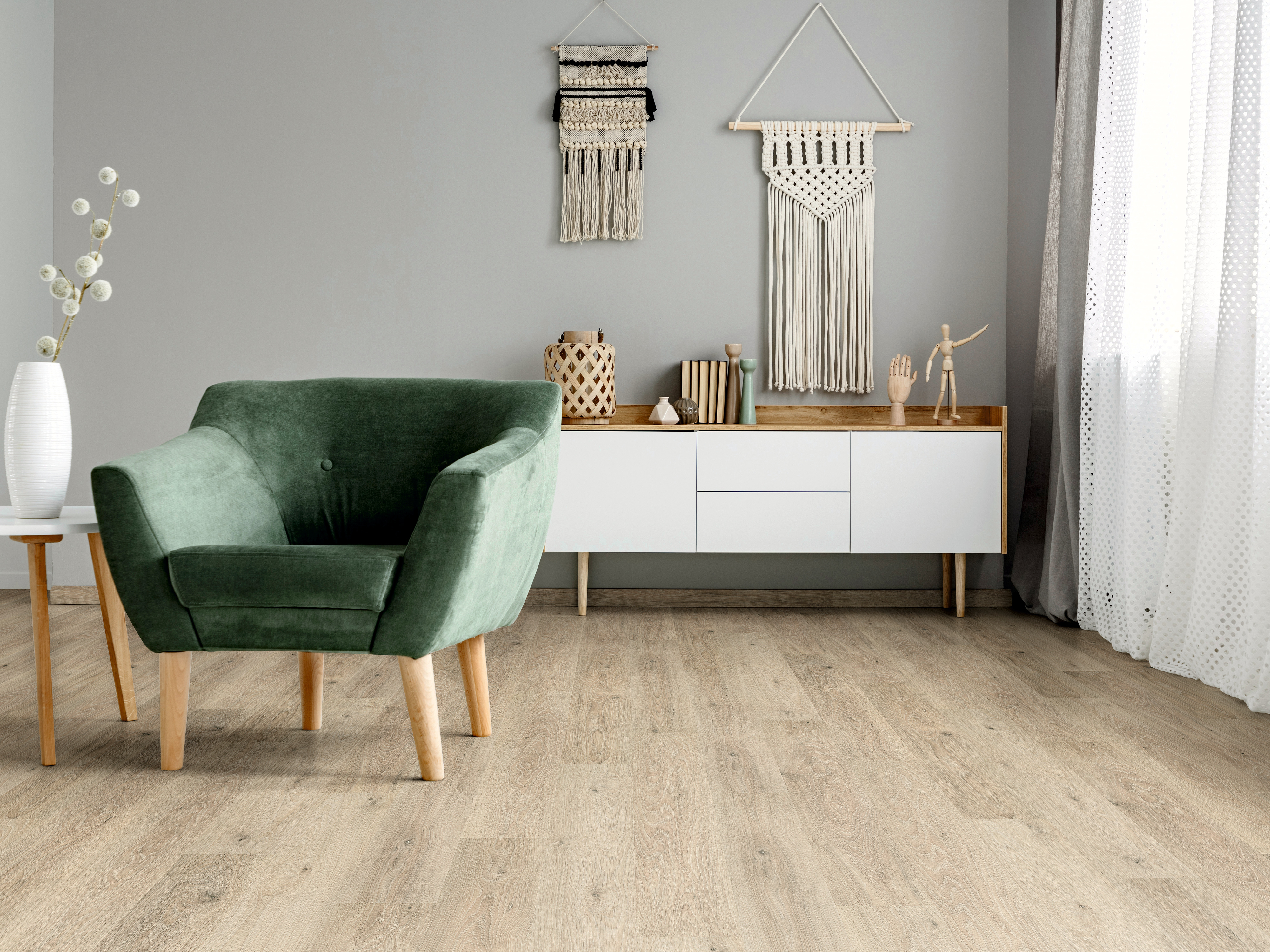 Laminat ist die ideale Kombination aus Design und Funktionalität. Die moderne Optik und die besonders pflegeleichte Oberfläche dieses Laminatbodens machen ihn zum perfekten Bodenbelag für fast jeden Bereich.