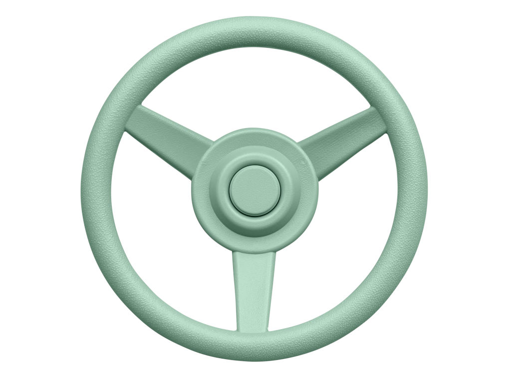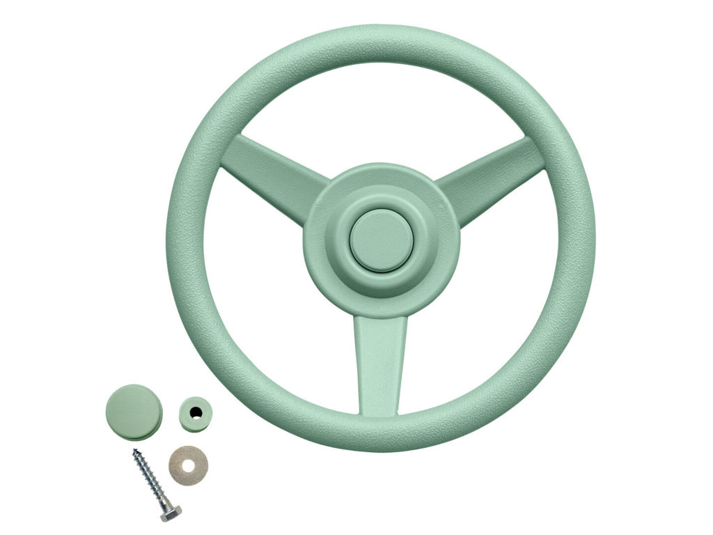 Das Lenkrad in Pastellgrün besteht aus robustem Kunststoff und hat einen Durchmesser von 30 cm. Es kann flexibel an Kinderspielgeräten oder Spielhäusern befestigt werden und regt Kinder zu kreativem Rollenspiel an.