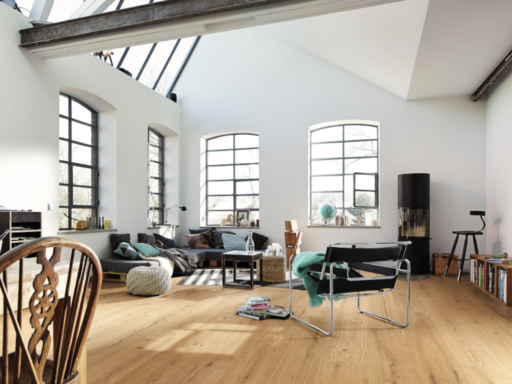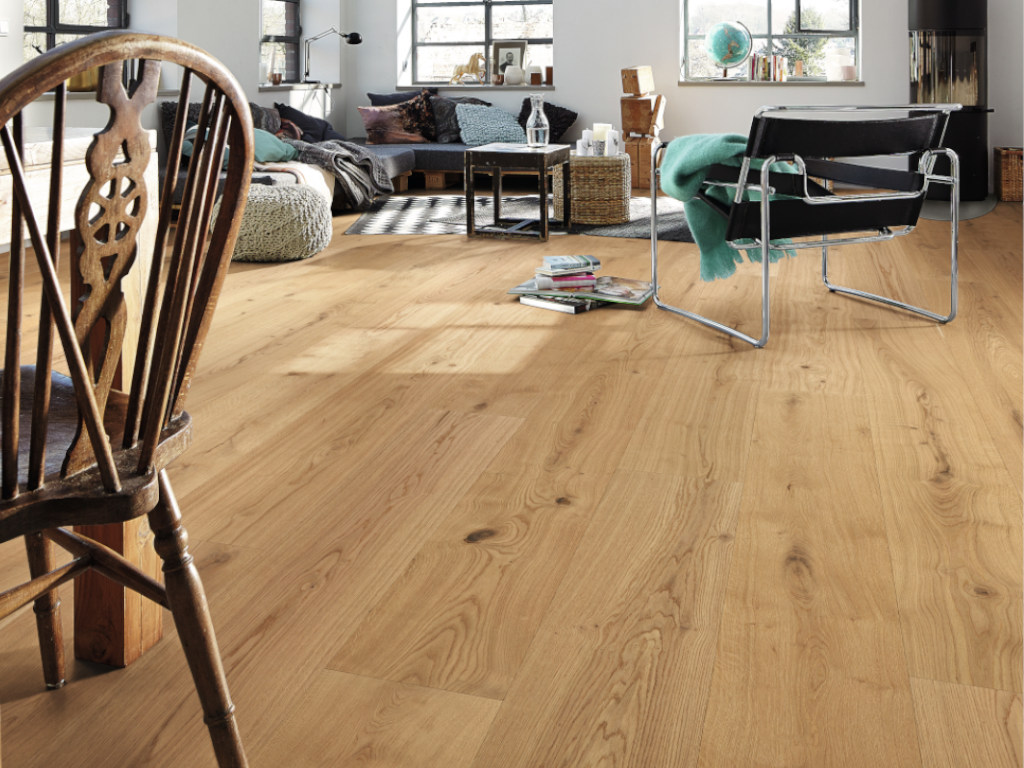 Dieser Eiche-Boden wirkt gemütlich und warm – so richtig zum Wohlfühlen! Eichenholz ist aufgrund seiner robusten Eigenschaften schwer entflammbar, dabei wärmeleitend und perfekt für die langfristige Alltagsnutzung geeignet.