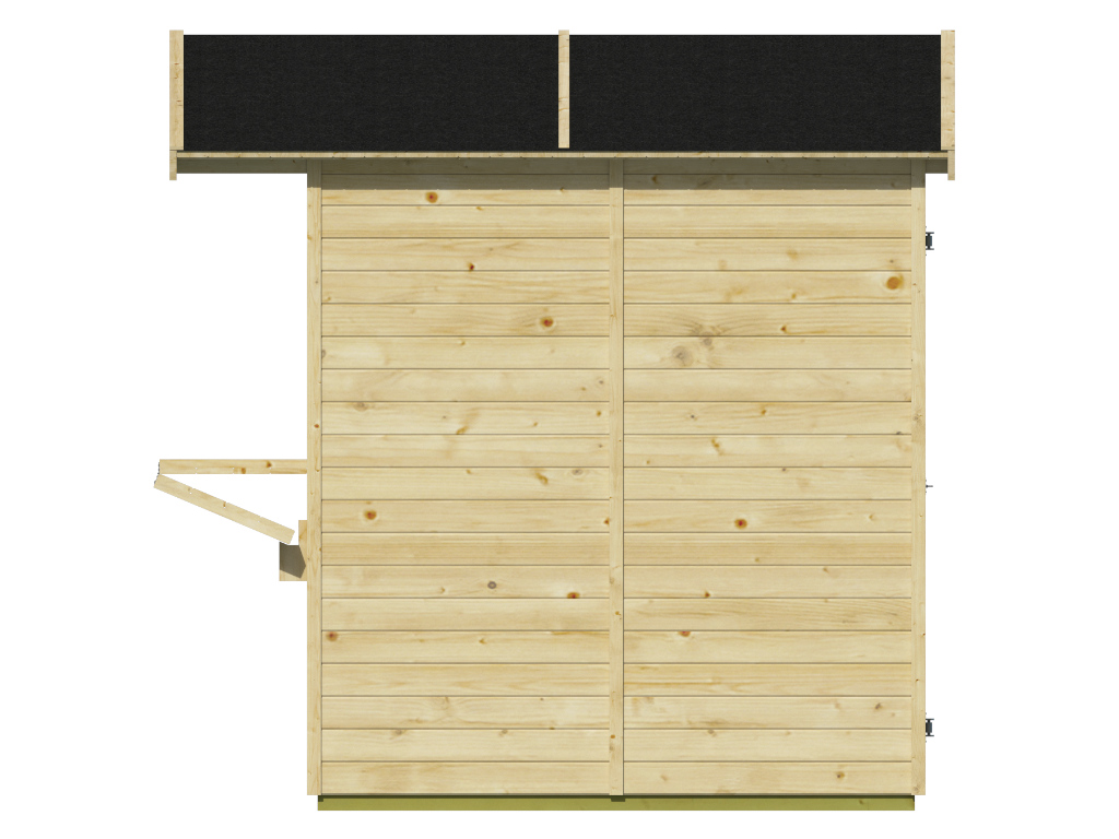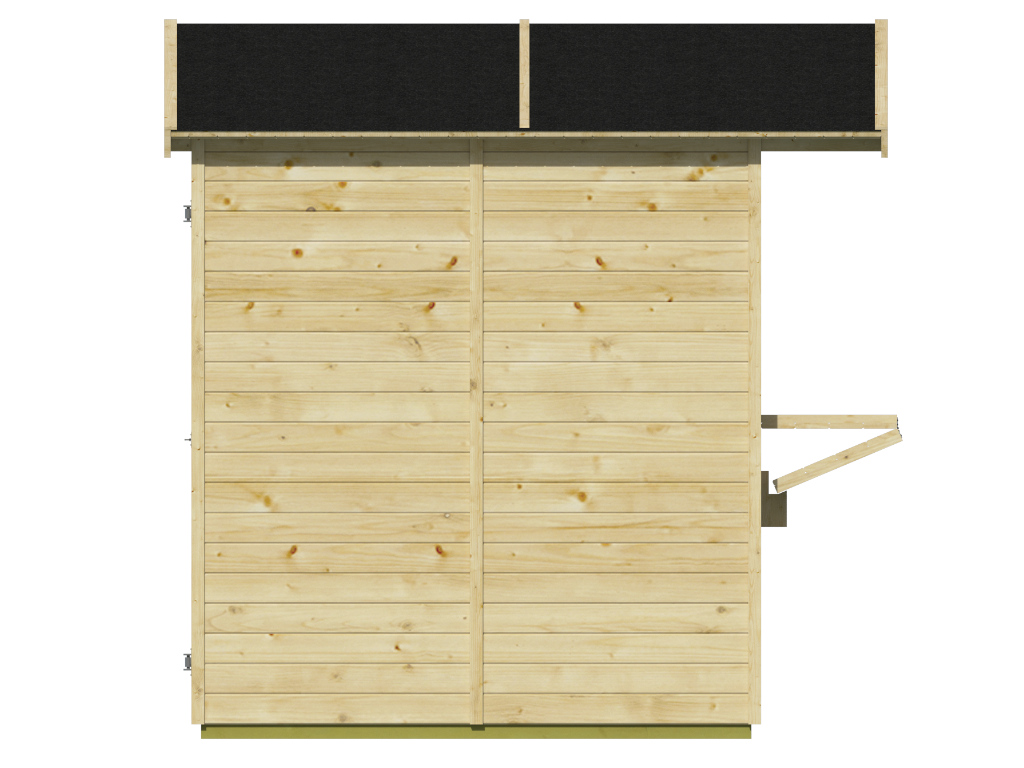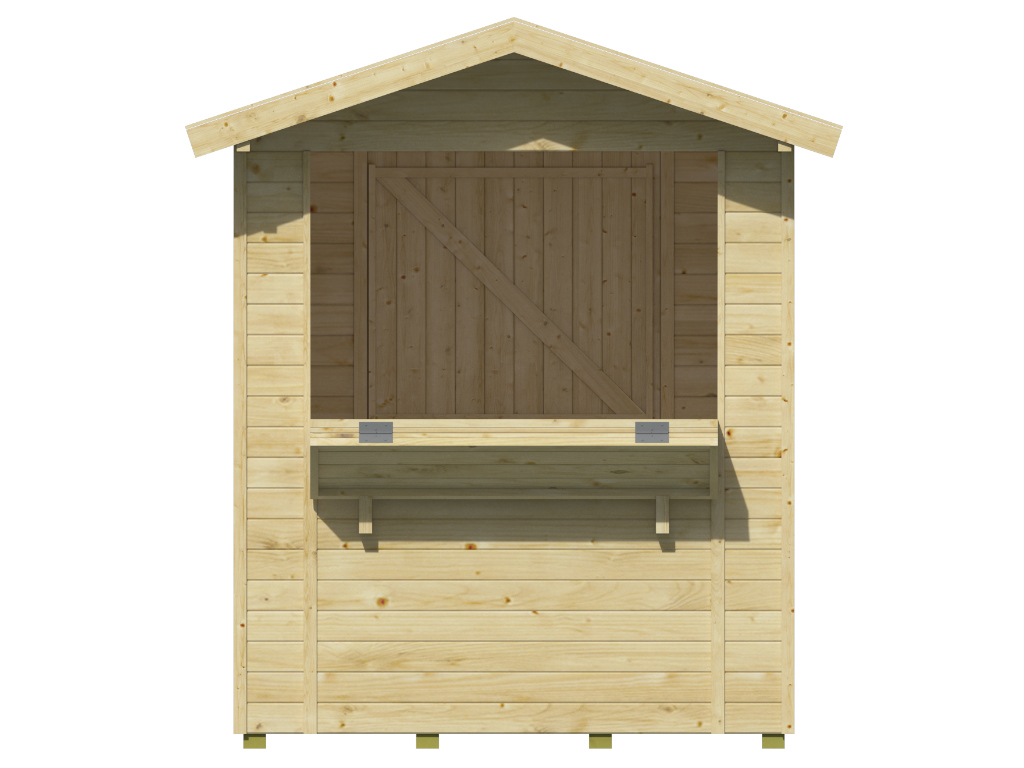 Der 2,9 m² große Marktstand mit einem Wandaußenmaß ohne Dachüberstände von 170 x 176 cm ist mit einem großem Verkaufsfenster (125 x 80 cm) ausgestattet, das sich von innen mit einem Riegel verschließen lässt. Bei geöffnetem Verkaufsfenster bietet dir der Marktstand eine komfortable ca. 42,3 cm tiefe Verkaufstheke, die dir ermöglicht eine Vielzahl deiner Produkte optimal zu präsentieren. - Einzeltür in Rückwand