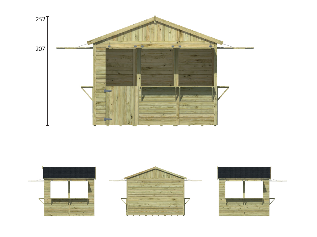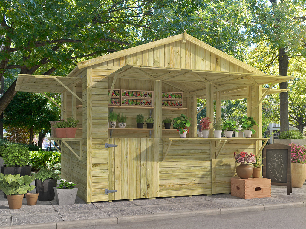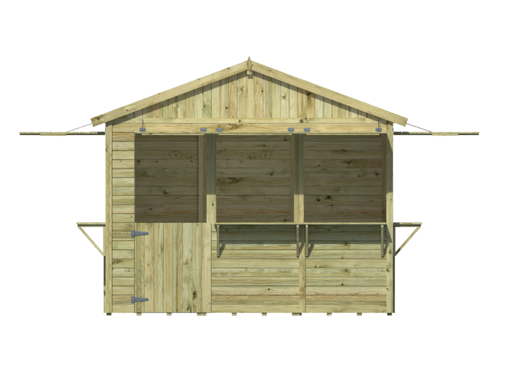 Der 7,2 m² große Marktstand mit einem Sockelmaß von 300 x 240 cm ist mit großen Verkaufsfenstern in der Front und den Seitenwänden ausgestattet. Jedes Verkaufsfenster ist zudem mit einer breiten Theke (ca. 26 cm tief) ausgestattet. Alle Verkaufsfenster lassen sich durch Zuklappen verschließen. In geöffnetem Zustand fungieren die Klappen als Vordächer. - Inkl. abschließbarer Tür in der Front