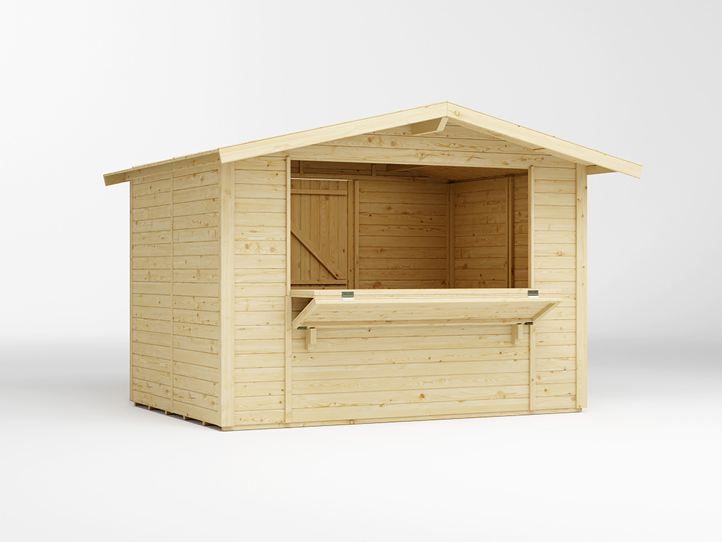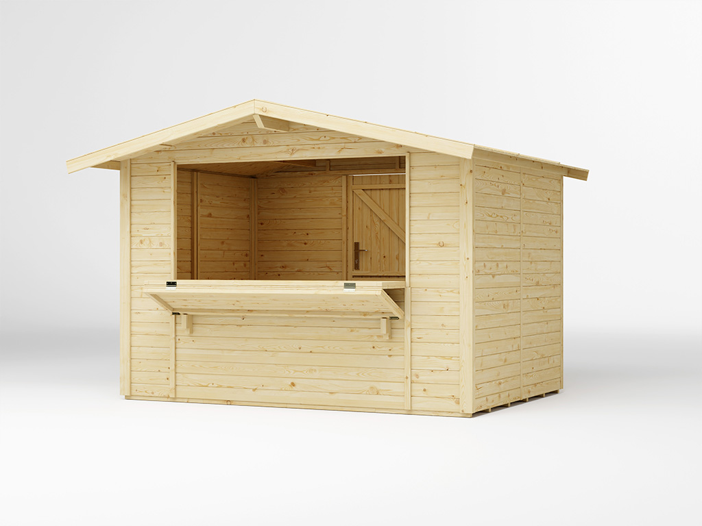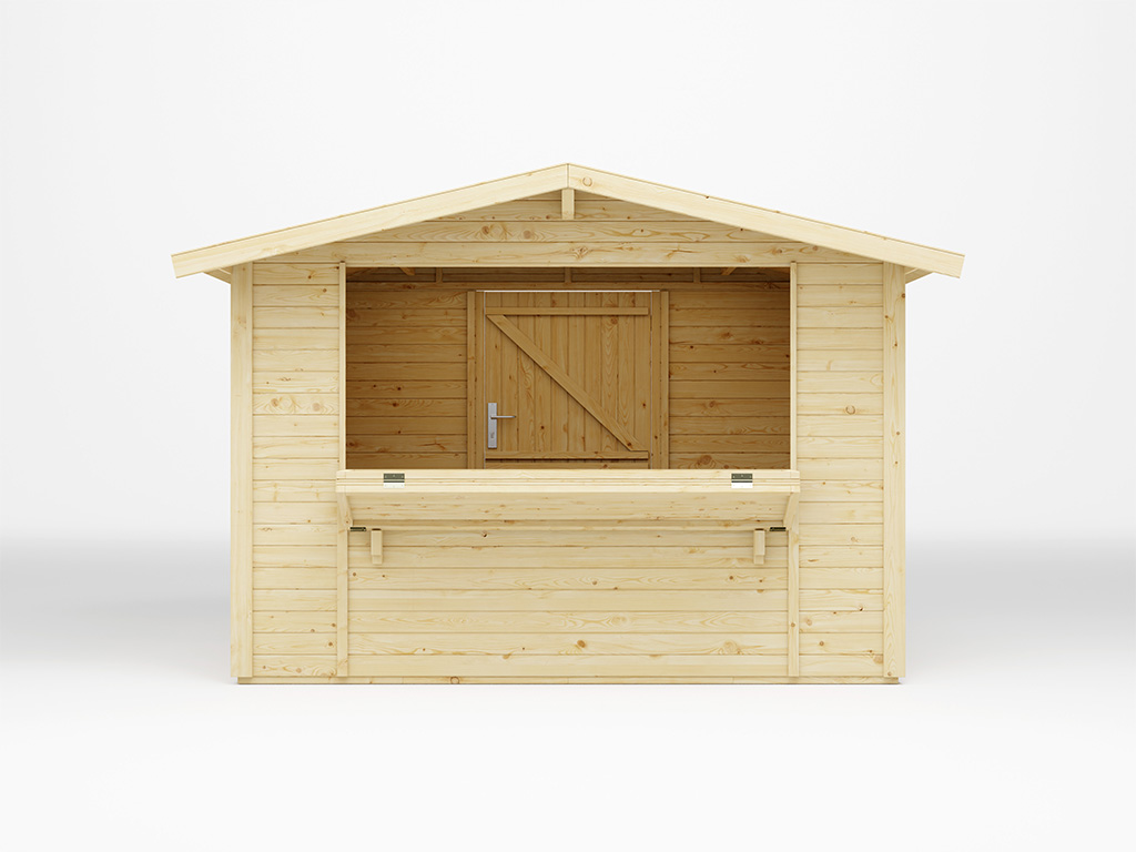 Der 6 m² große Marktstand mit einem Sockelmaße von 300 x 200 cm ist mit einem großen Verkaufsfenster (ca. 197 x 85 cm) ausgestattet, das sich von innen mit einem Riegel verschließen lässt. Die ausklappbare Theke ist ca. 40 cm tief. - Inkl. abschließbarer Tür in Rückwand