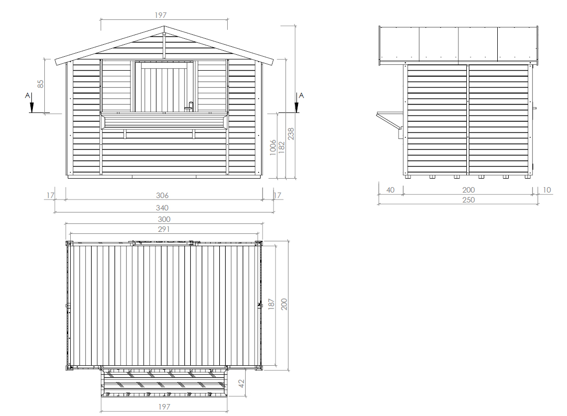 | Außenmaß inkl. Dachüberstand (B x T): | 340 x 250 cm |