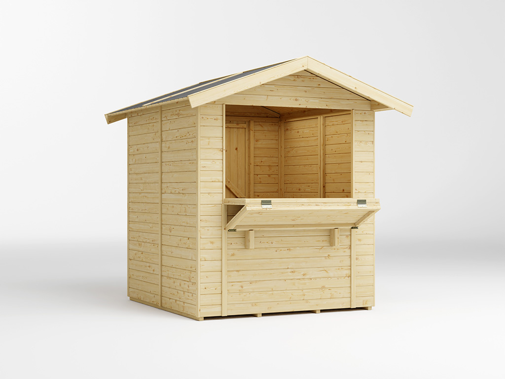 Der Marktstand aus nordischem Fichtenholz bietet bei geöffnetem Verkaufsfenster ein praktisches Vordach, dass Deine Waren und auch deine Kundschaft vor Regen und Schnee schützt. - Einfacher Aufbau