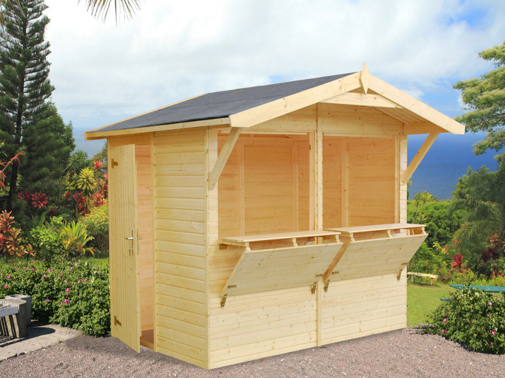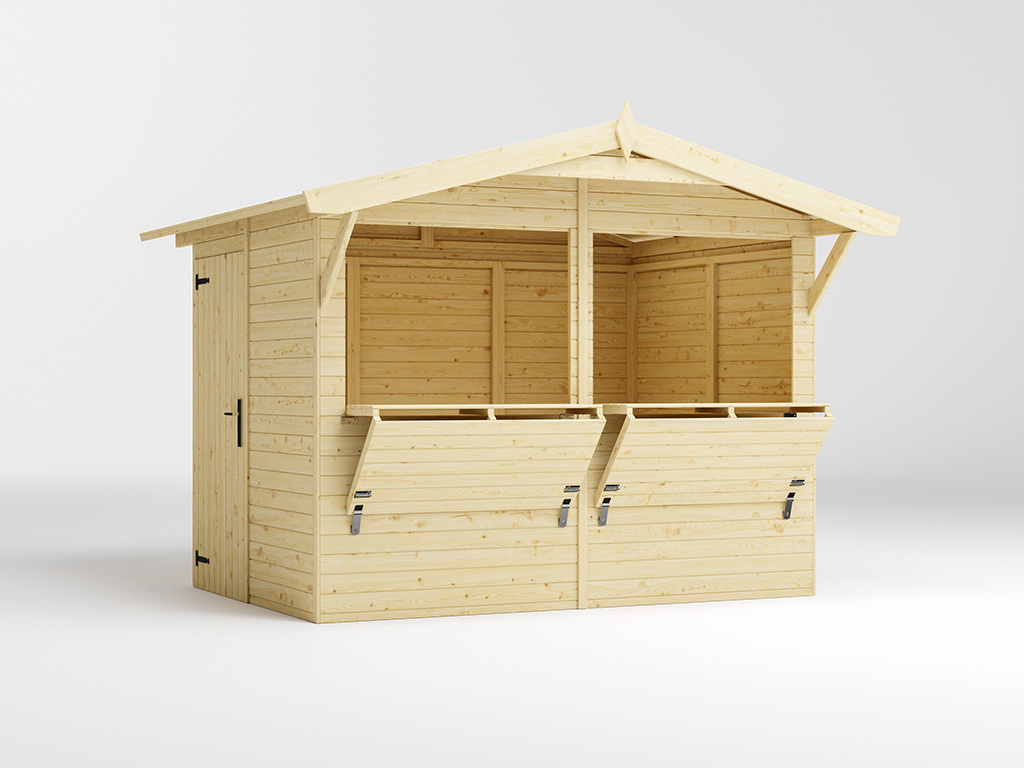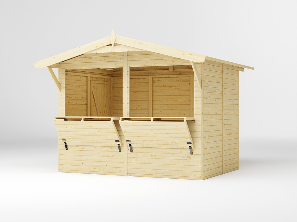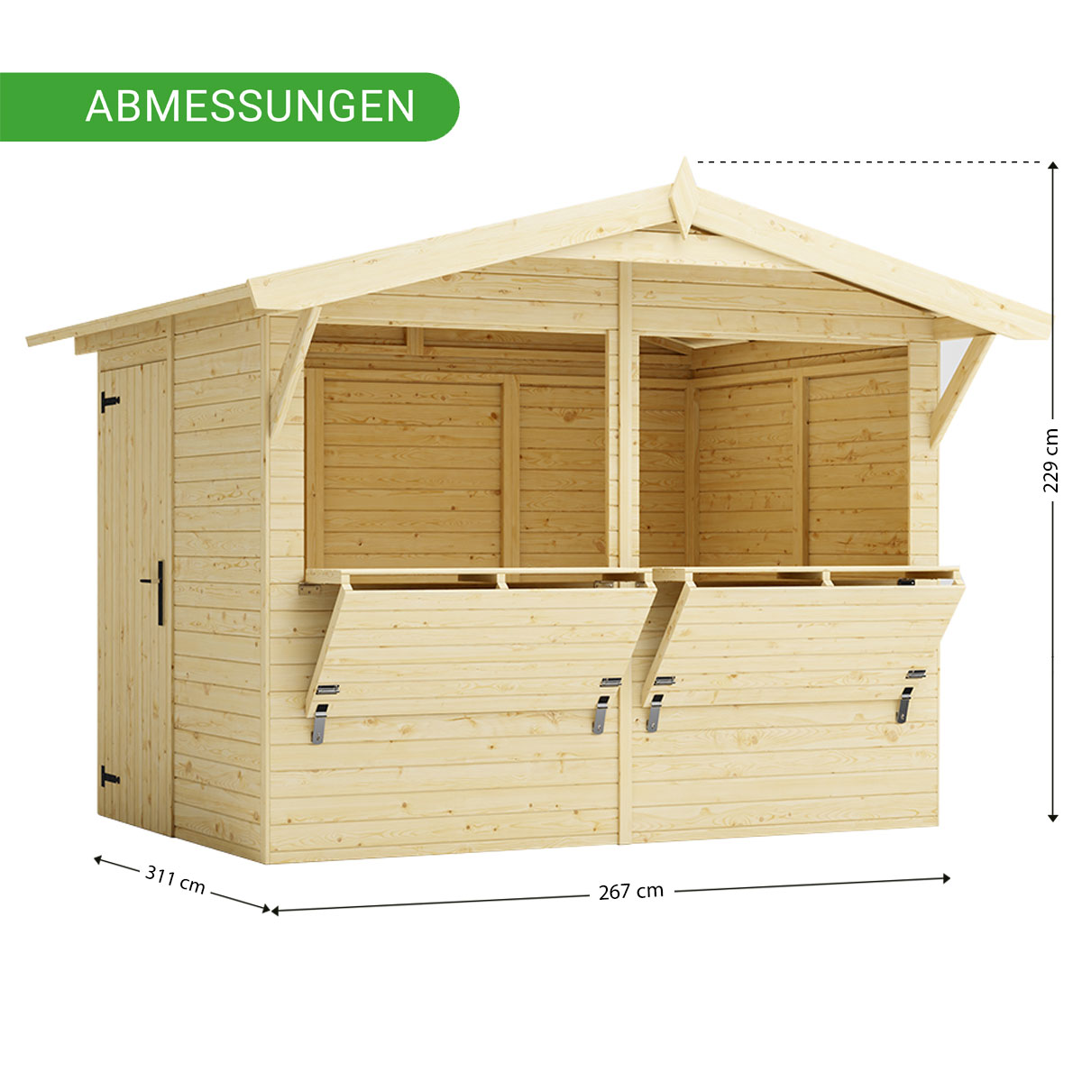 Der 5 m² große Marktstand mit einem Wandaußenmaß inklusive Dachüberstände von 311 x 267 cm ist mit einem zweigeteilten Verkaufsfenster (je 117,5 x 82,3 cm) ausgestattet, die sich von verschließen lassen. - Inkl. abschließbarer Seitentür
