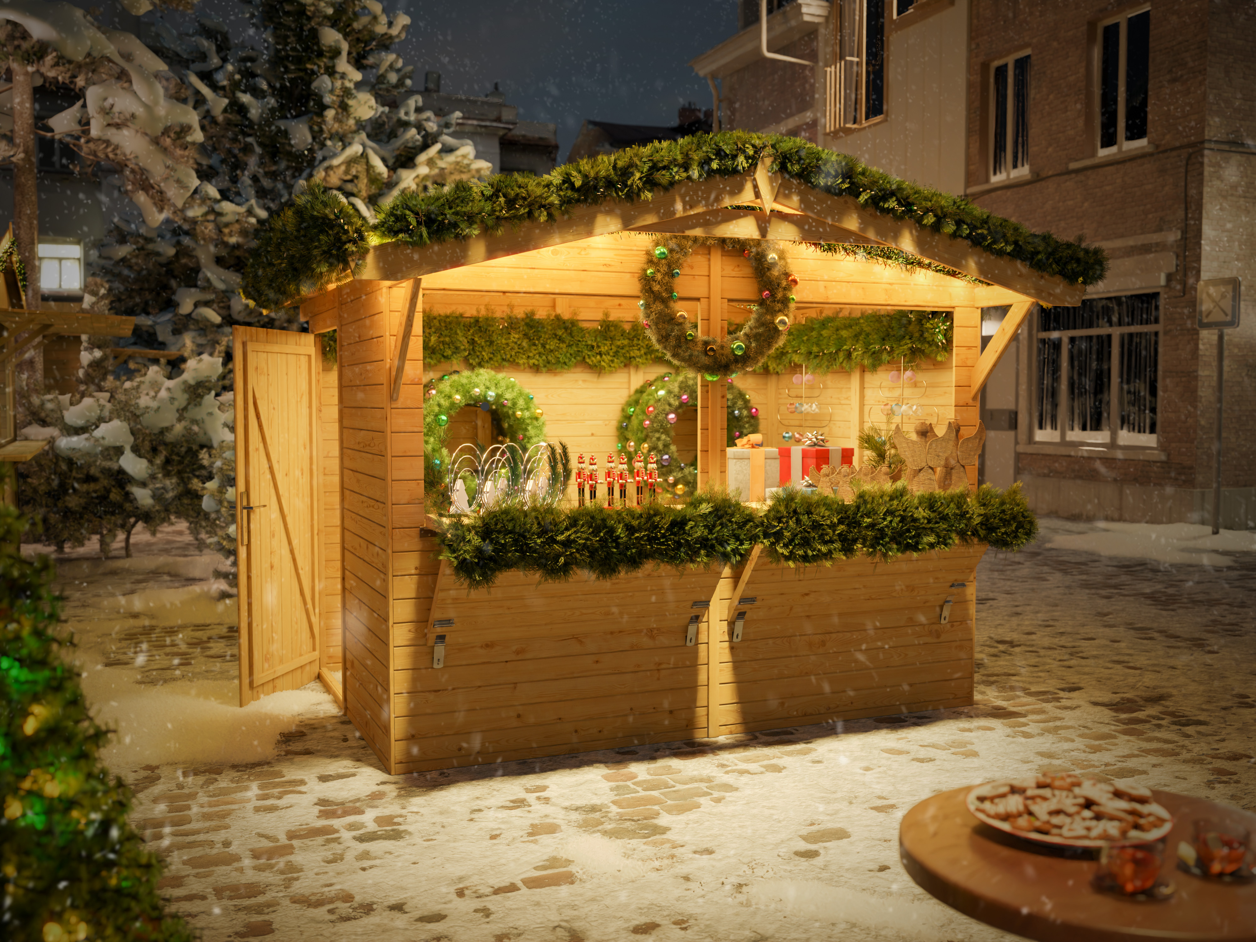 Der Marktstand aus nordischem Fichtenholz bietet bei geöffnetem Verkaufsfenster ein praktisches Vordach, dass Deine Waren und auch deine Kundschaft vor Regen und Schnee schützt. - Einfacher Aufbau