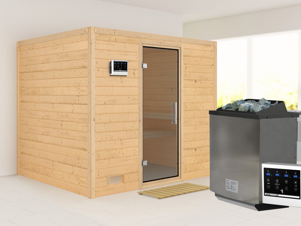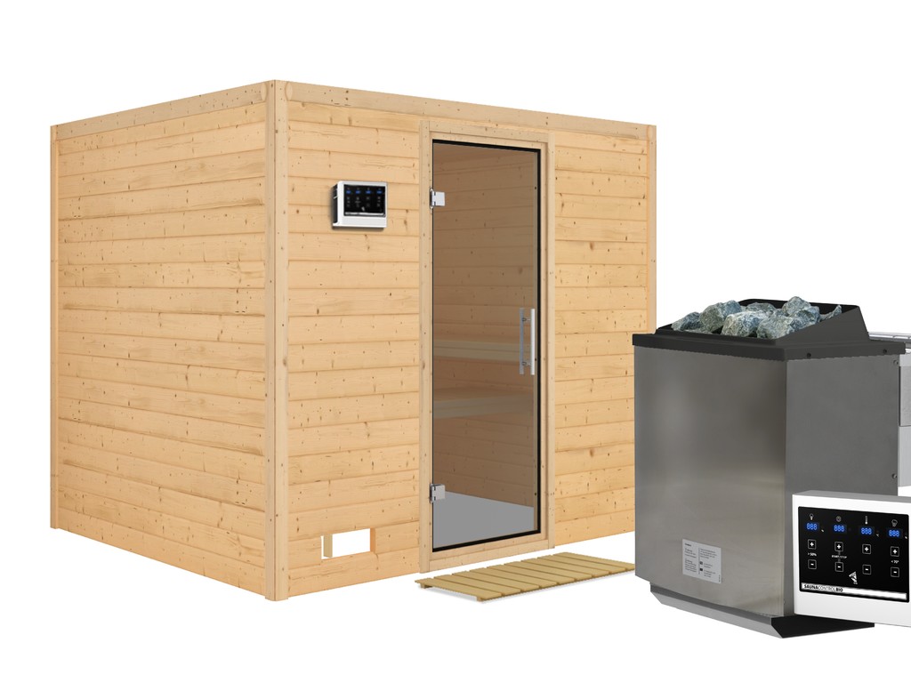 Diese Innensauna wird mit Saunaofen und einer externen Steuerung geliefert. Die Anbringung des Steuergerätes erfolgt an der Außenseite der Sauna. Ganz komfortabel kann somit die Saunasteuerung von außen erledigt und die Temperatur exakt bestimmt werden. Zusätzlich verfügt das Steuergerät über eine Anschlussstelle, über die ein weiteres elektrisches Gerät bedient werden kann.