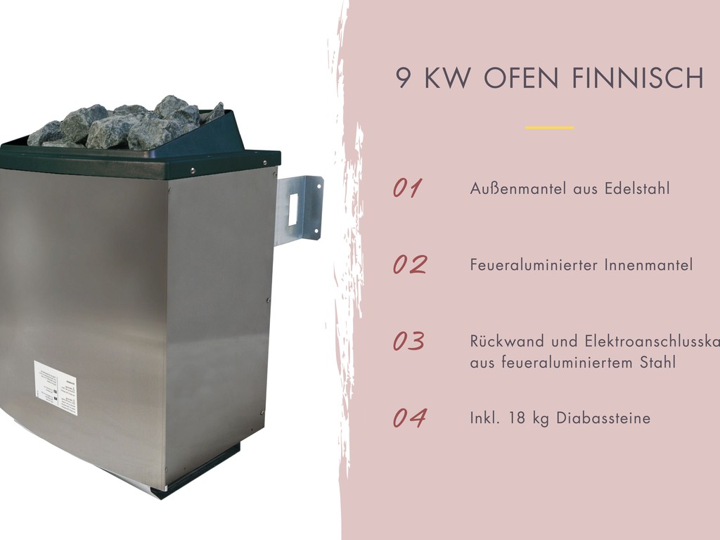 Das Herzstück einer Sauna ist ihr Ofen: Er haucht ihr Leben ein, bestimmt wie warm es wird und welche Art von Saunagang genossen werden kann. Für eine klassische, finnische Sauna ist dieser 9 kW (3 x 16 A) starke Ofen optimal. Er erreicht eine Temperatur von bis zu 110 °C und besitzt einen feueraluminierten Innenmantel.