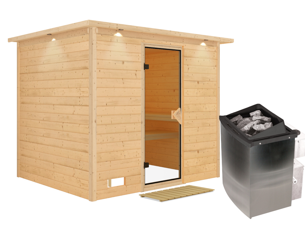 B x T x H: 259 x 210 x 205 cm, 3 Liegen, inkl. 9 kW Saunaofen + int. Steuerung
