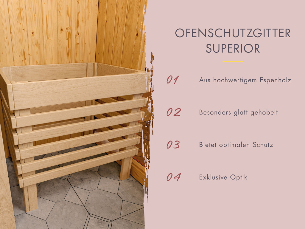 3 Liegen, Ofenschutzgitter aus stabilem Fichtenholz, 3 Liegen, 1 Kopfstütze aus Espenholz, 9 kW Ofen mit integrierter Steuerung, Dachkranz inkl. 3 LED-Strahlern á 7, 5 Watt, Bodenrost, Montageanleitung.