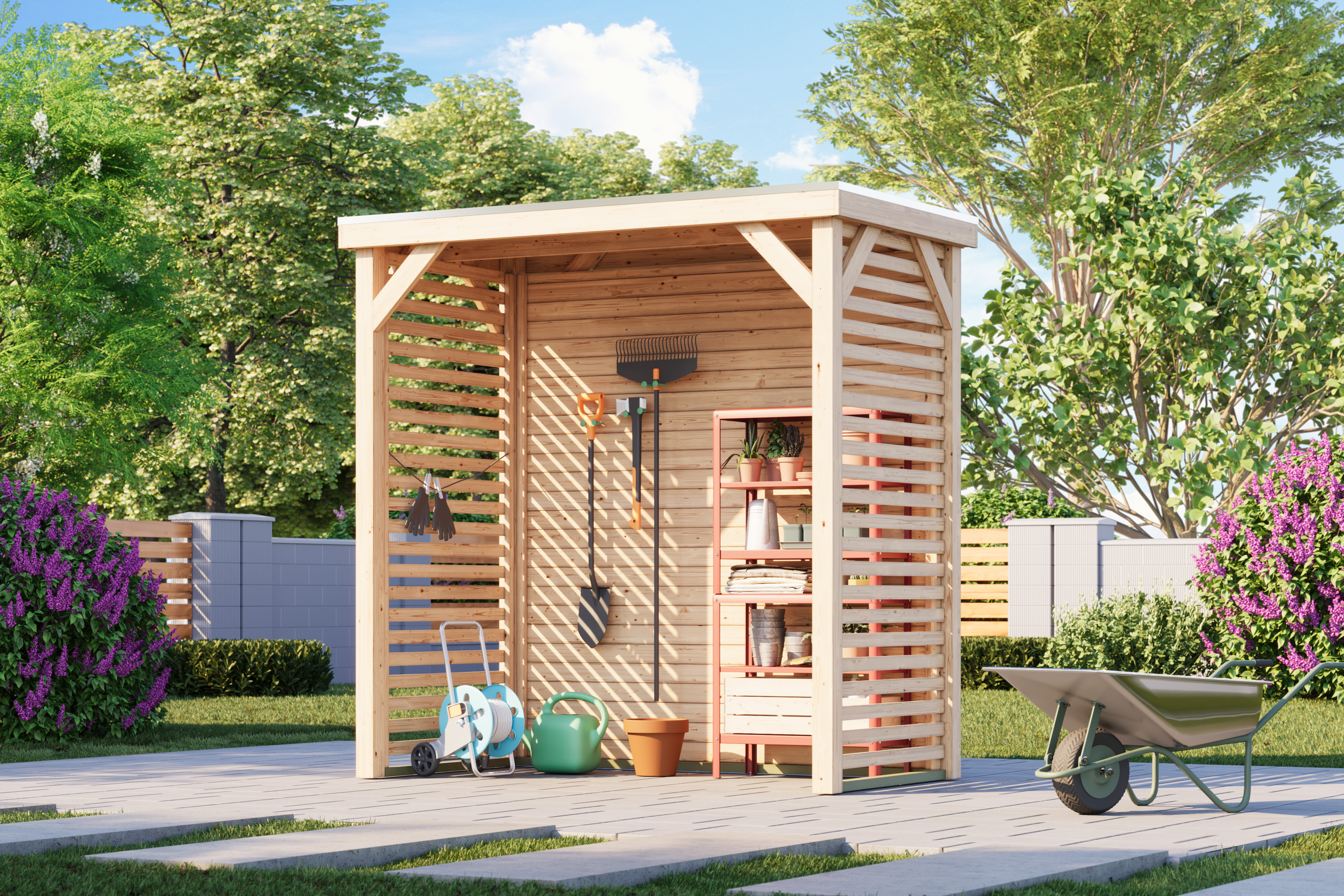 Der Pavillon Gartenlaube Cubeco halb aus naturbelassener Fichte ist eine halboffene Lösung für Terrasse oder Garten und bietet eine geschützte, gleichzeitig luftige Sitzgelegenheit im Freien. Das Massivholzdach aus Nut- und Federbrettern sorgt für Stabilität und ein harmonisches Erscheinungsbild, während der Pavillon ohne Dachbelag geliefert wird, sodass du die Eindeckung flexibel wählen kannst.
