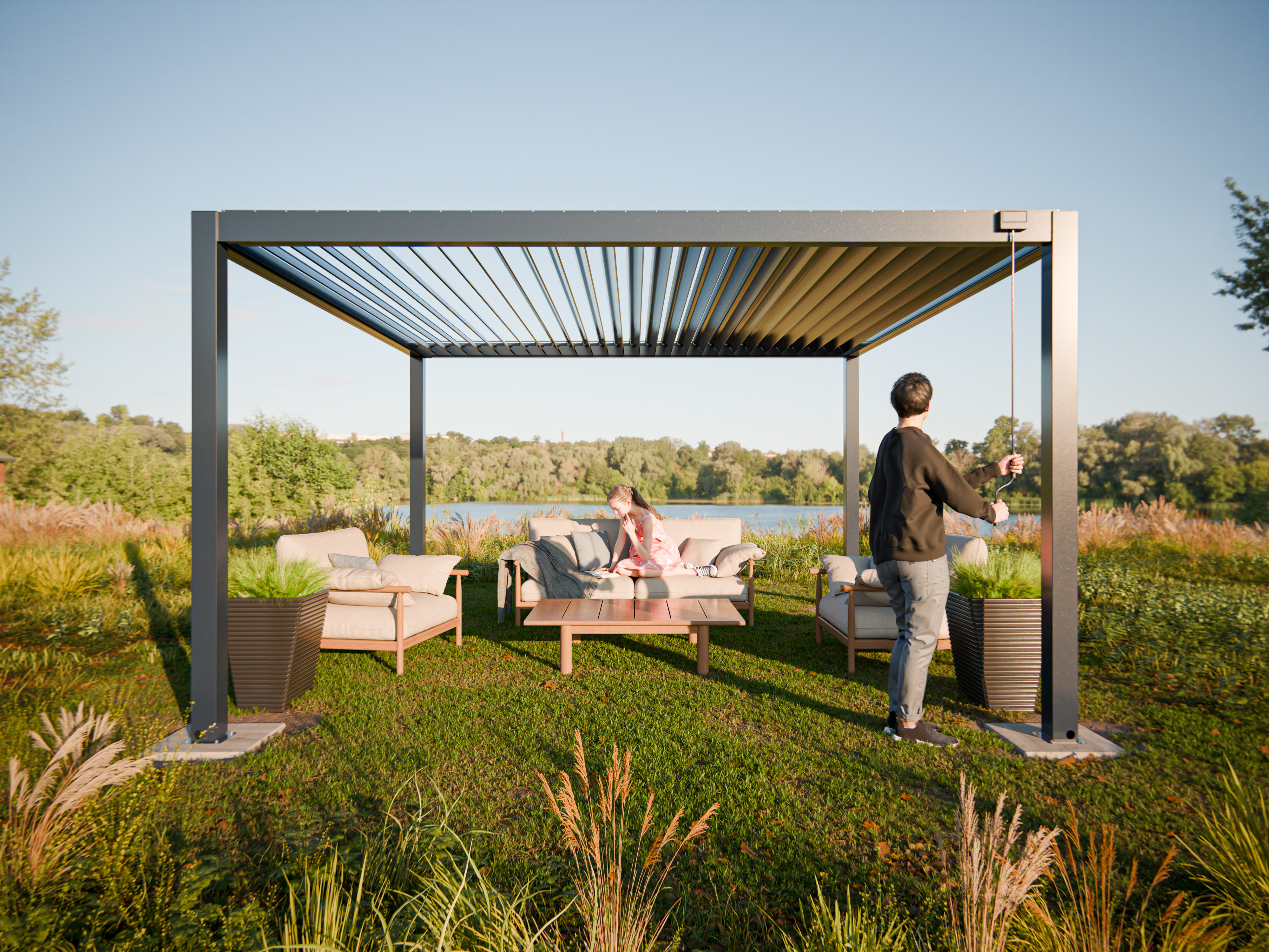 Das Lamellendach lässt sich je nach Modell entweder mit einem robustem Kurbelmechanismus oder elektrisch ferngesteuert in kürzester Zeit öffnen und schließen. Bitte achte beim Kauf darauf, dass du die für dich passende Variante auswählst.