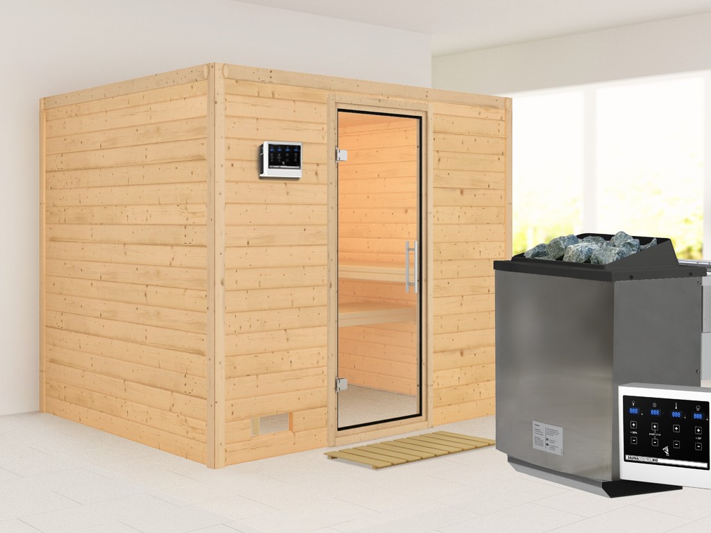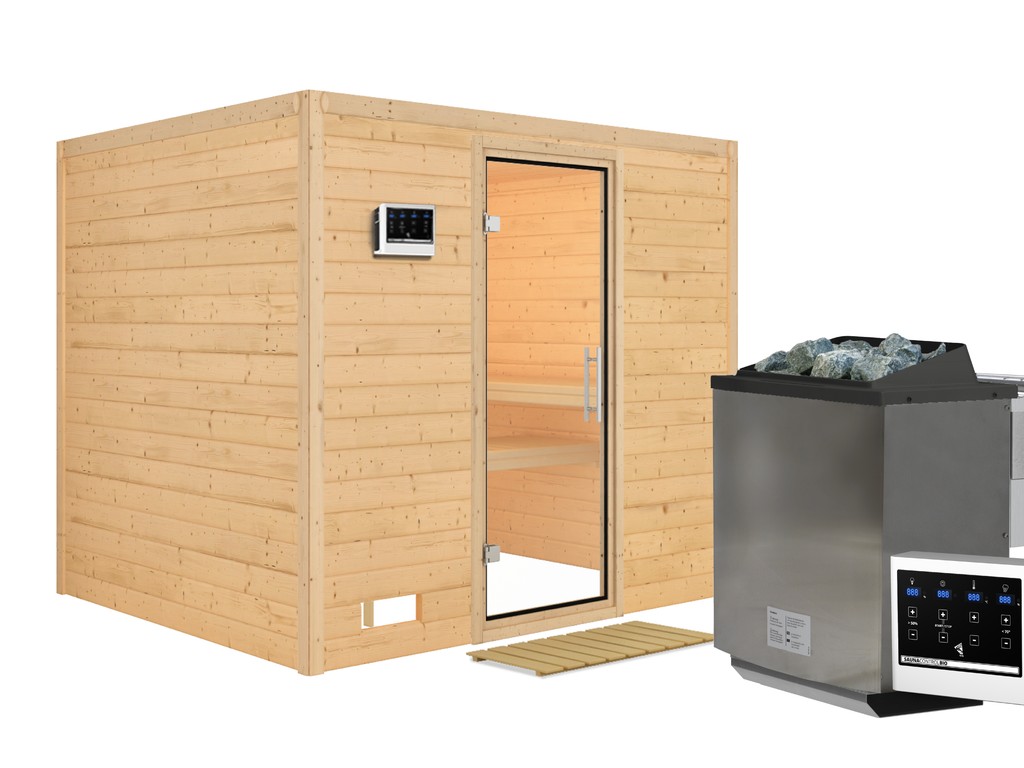 Bei dieser Innensauna ist ein Saunaofen mit einer externen Steuerung inklusive. Das Steuergerät wird außerhalb der Sauna angebracht. Auf diese Weise fängt schon vor dem Saunieren der Komfort an – mit einer bequemen Bedienung von außen und einer noch exakteren Temperatureinstellung. Weitere elektrische Geräte, wie die Kabinenbeleuchtung, können ebenso an die externe Steuerung angeschlossen und bedient werden.