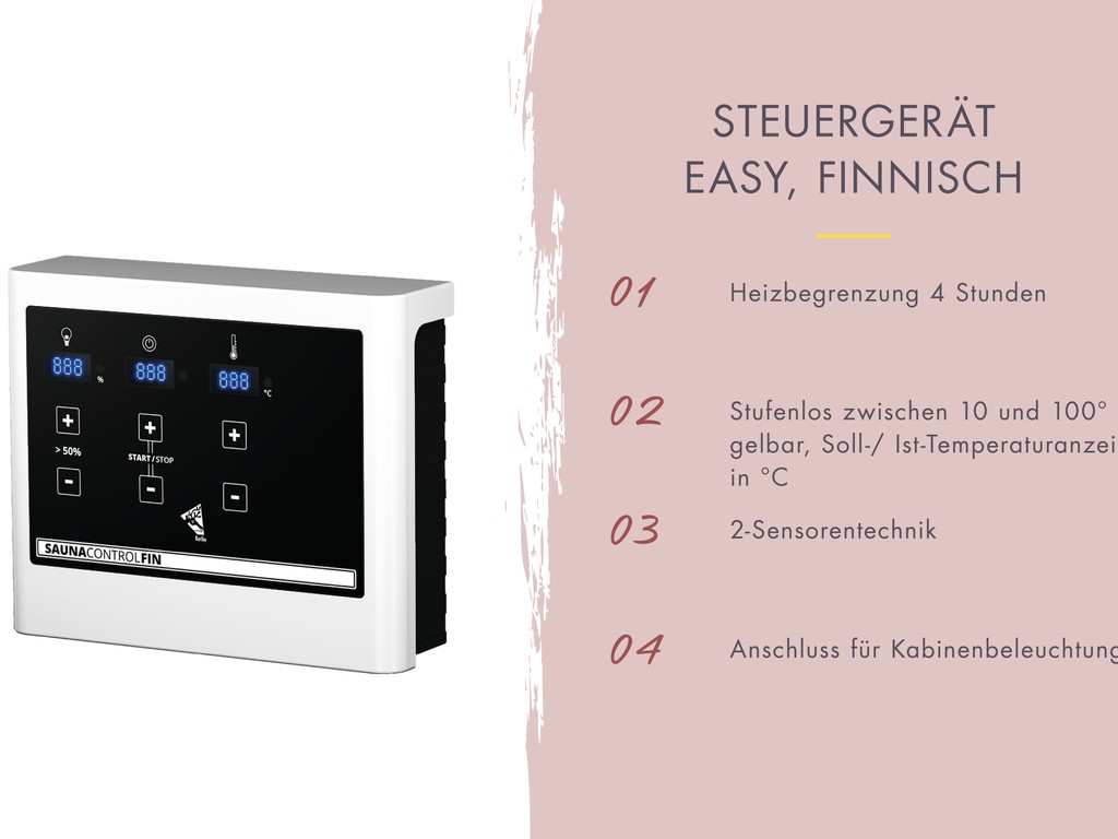 3 Liegen, 9 kW Saunaofen, ext. Steuerung, Kopfstütze, Bodenrost, Montageanleitung.