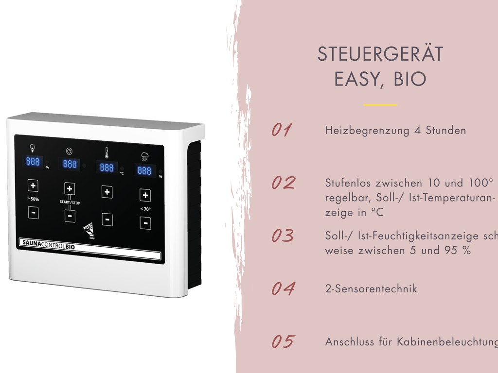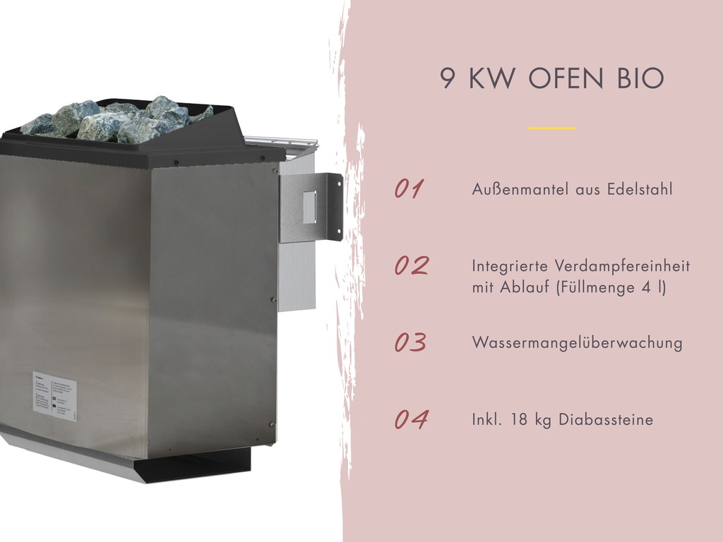 9 kW Bio-Kombiofen, ext. Steuerung, 3 Liegen, Kopfstütze, Bodenrost, Ofenschutzgitter, Montageanleitung.