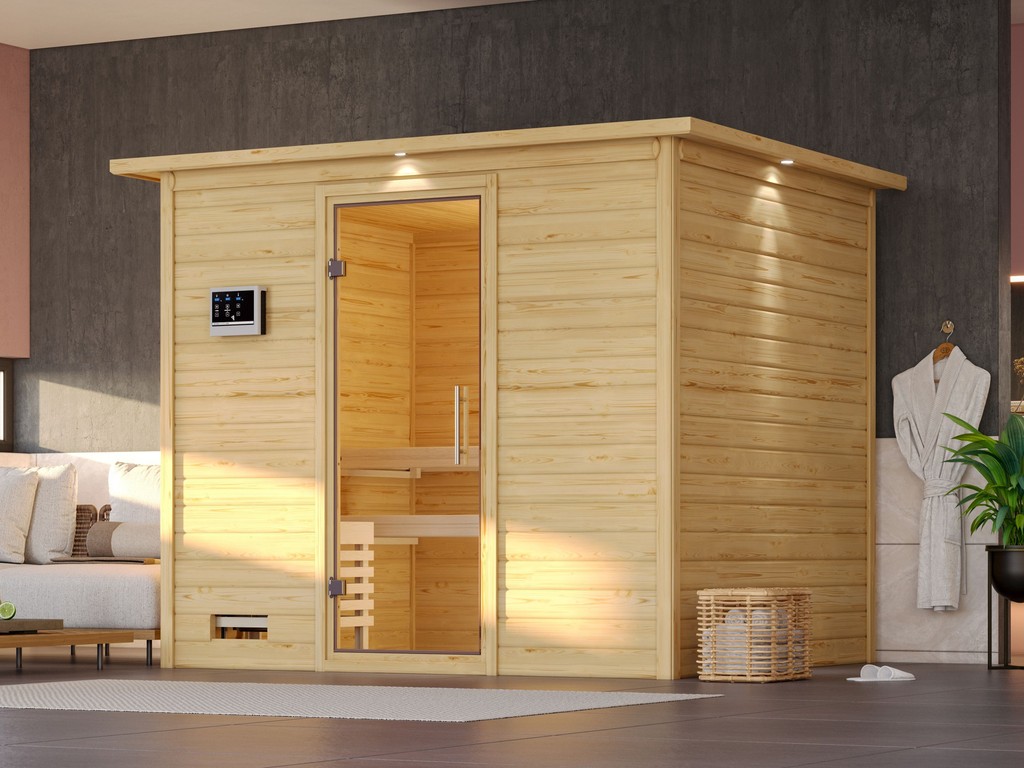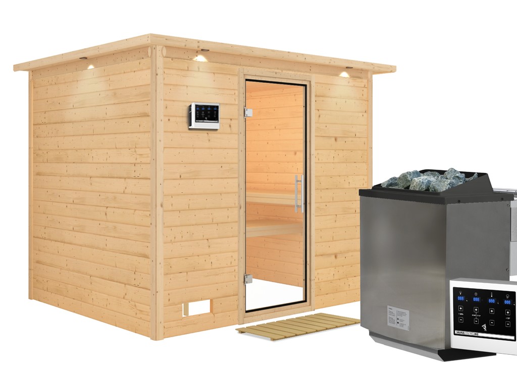 Diese Innensauna wird einschließlich Saunaofen mit externer Steuerung geliefert. Die Anbringung an der Außenseite der Sauna ermöglicht eine praktische Bedienung vor dem Saunieren und eine noch exaktere Einstellung der Temperatur. Weitere elektrische Geräte, wie eine Kabinenbeleuchtung, können ebenso an die externe Steuerung angeschlossen und mit dieser bedient werden.