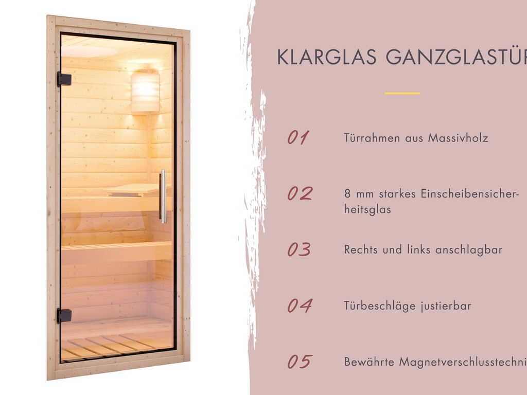 - Dachkranz: Der im Paket enthaltene Dachkranz mit integrierten LED-Lampen zaubert harmonisches Licht um Deine Sauna.