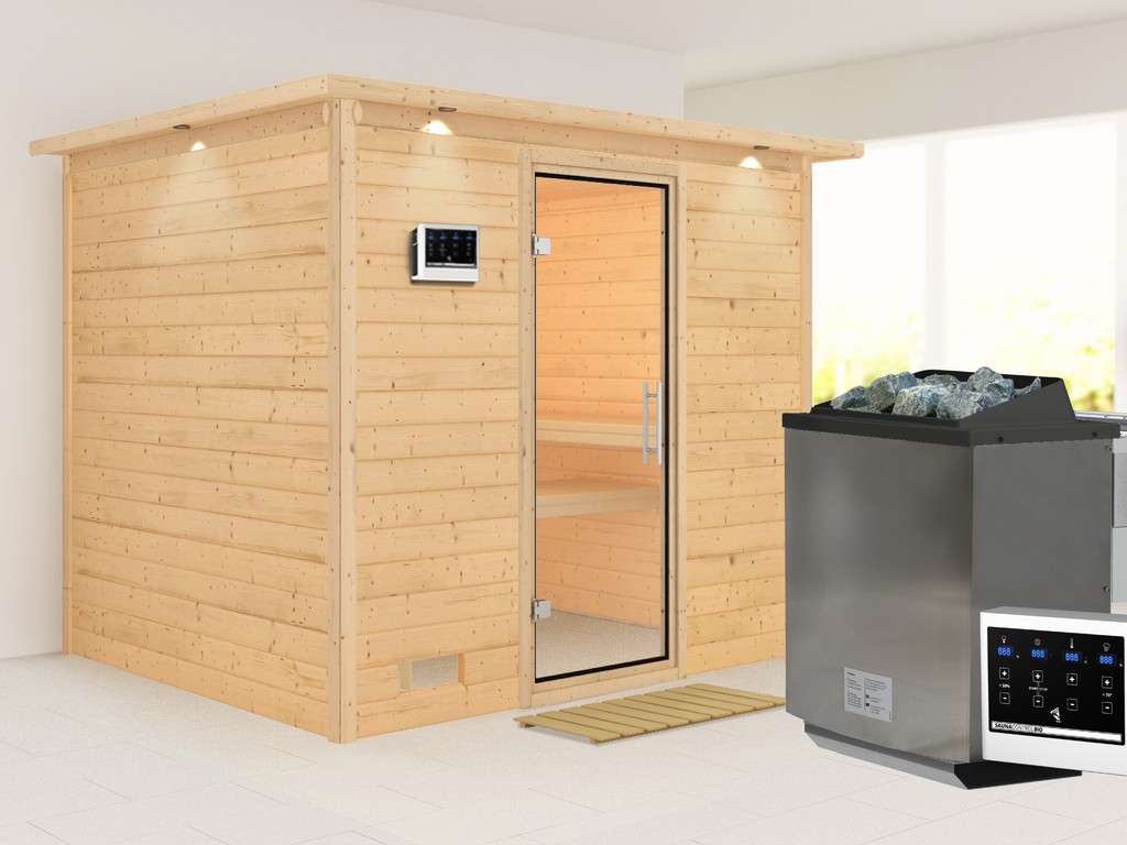 Sauna Massivholzsauna Sparset Valida GTF inkl....B x T x H: 189 x 172 x 203 cm, inkl. 9 kW Saunaofen + int. Steuerung, inkl. Leuchtenset