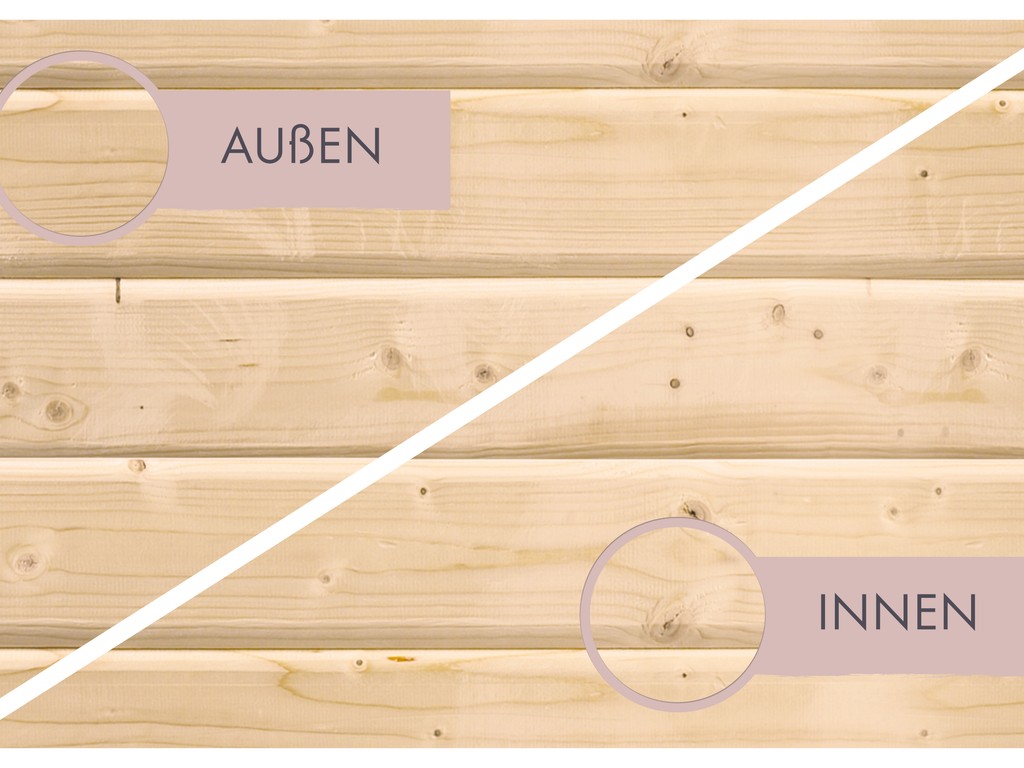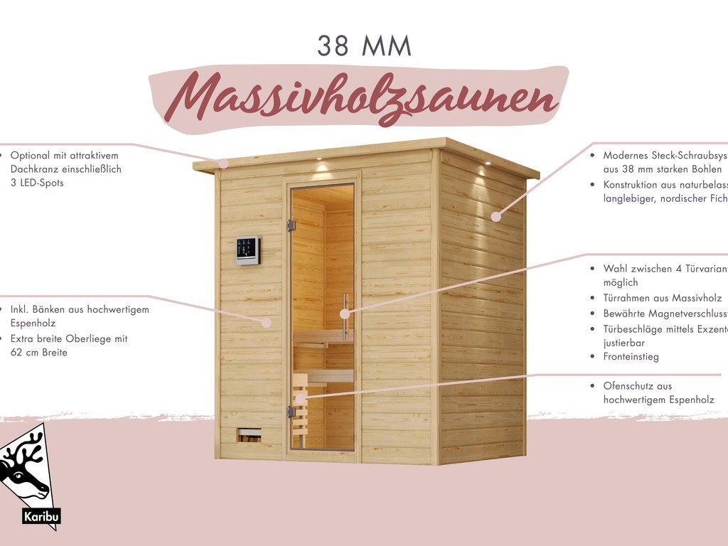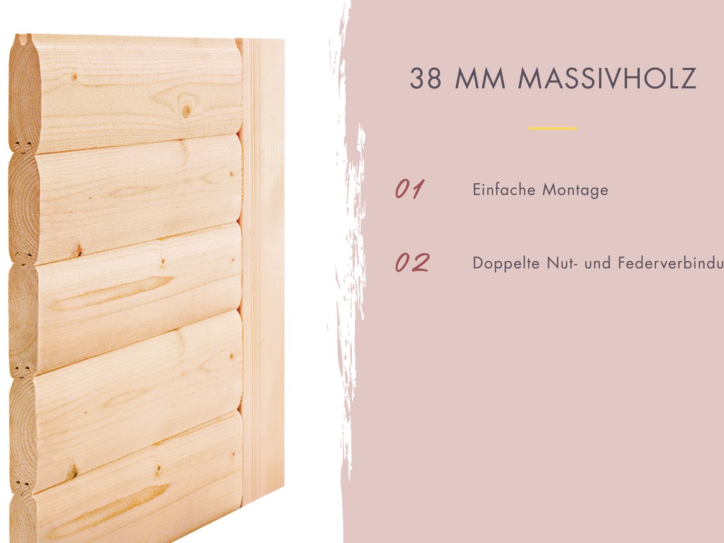 38 mm Vollholz-Bohlen und ein mit Mineralwolle und Softline-Profilholz gedämmtes Dach bilden das Gerüst für diese Massivholzsauna. Für gute Formstabilität und einen schnellen Aufbau sorgen zum einen das praktische Steck- und Schraubsystem, zum anderen die sicheren Doppelnut und -feder Verbindungen.