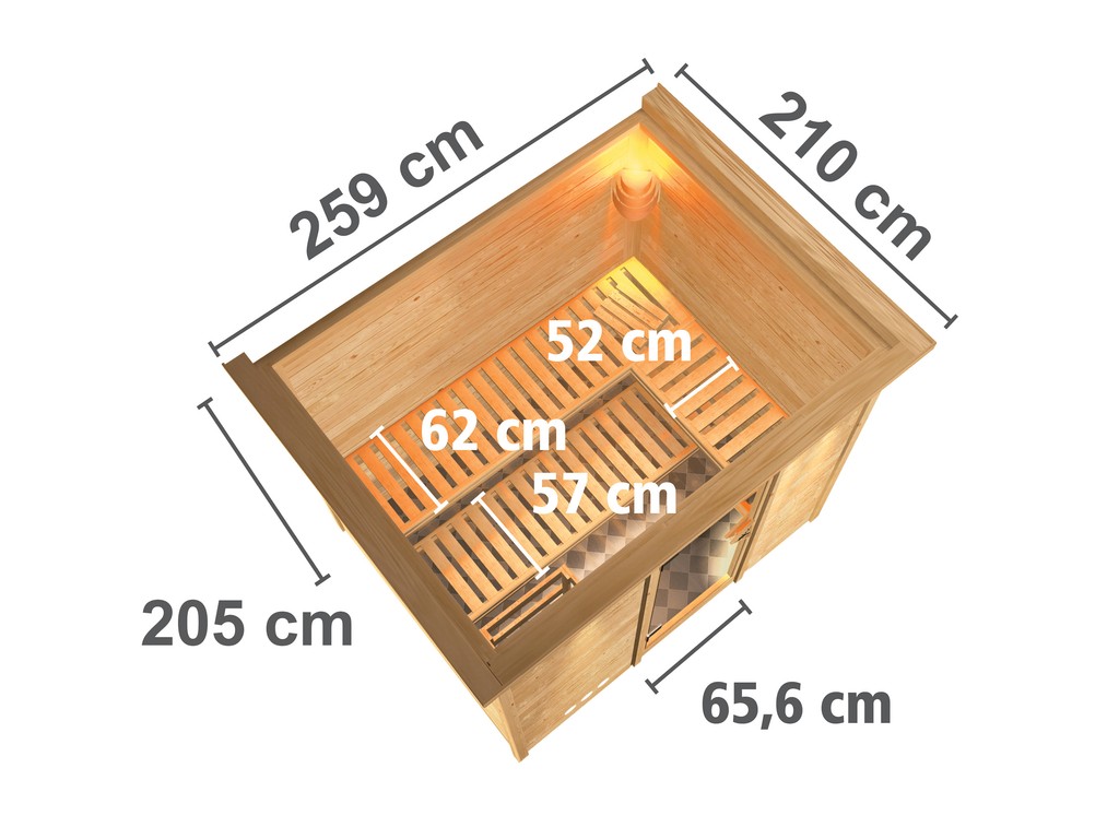 B x T x H: 259 x 210 x 205 cm, 3 Liegen, inkl. 9 kW Bio-Kombiofen + ext. Steuerung