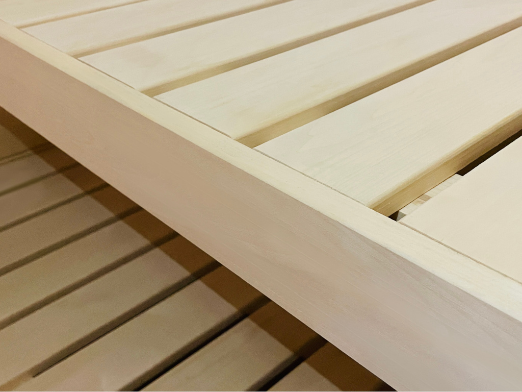 Bodenrost aus fußwarmem Fichtenholz: für angenehmes Auftreten innerhalb und außerhalb der Sauna.