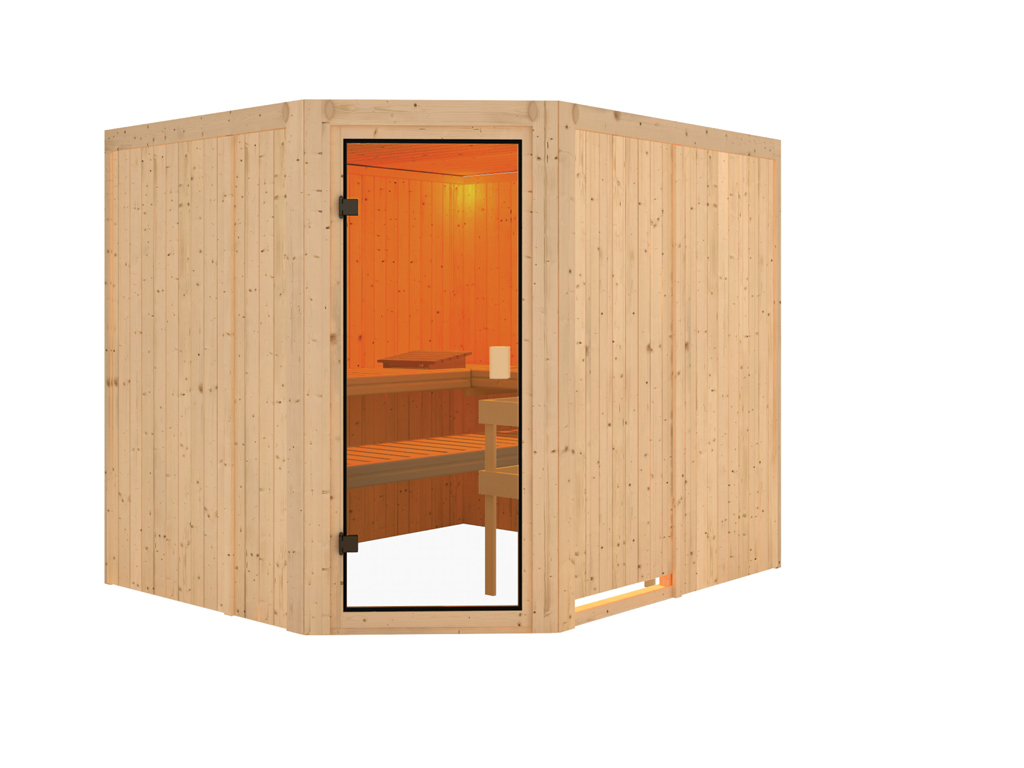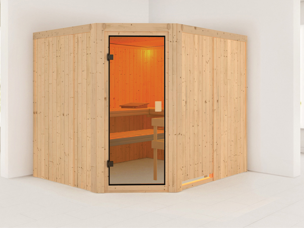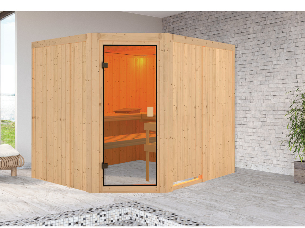 Massivholzsauna 38 mm KatieB x T x H: 196 x 146 x 198 cm, Eckeinstieg, inkl. 2 Liegen