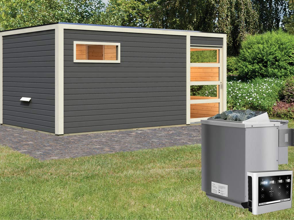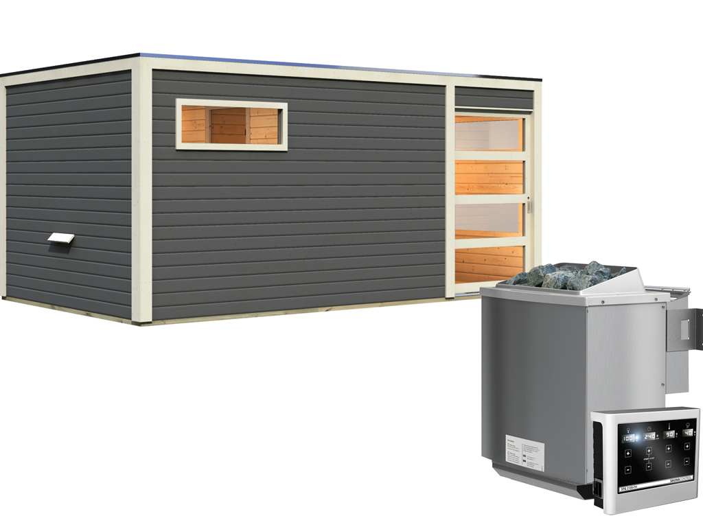 Saunahaus Hygge Grau mit Schiebetür & Vorraum, inkl. 9 kW Bio-Kombiofen mit externer Steuerung