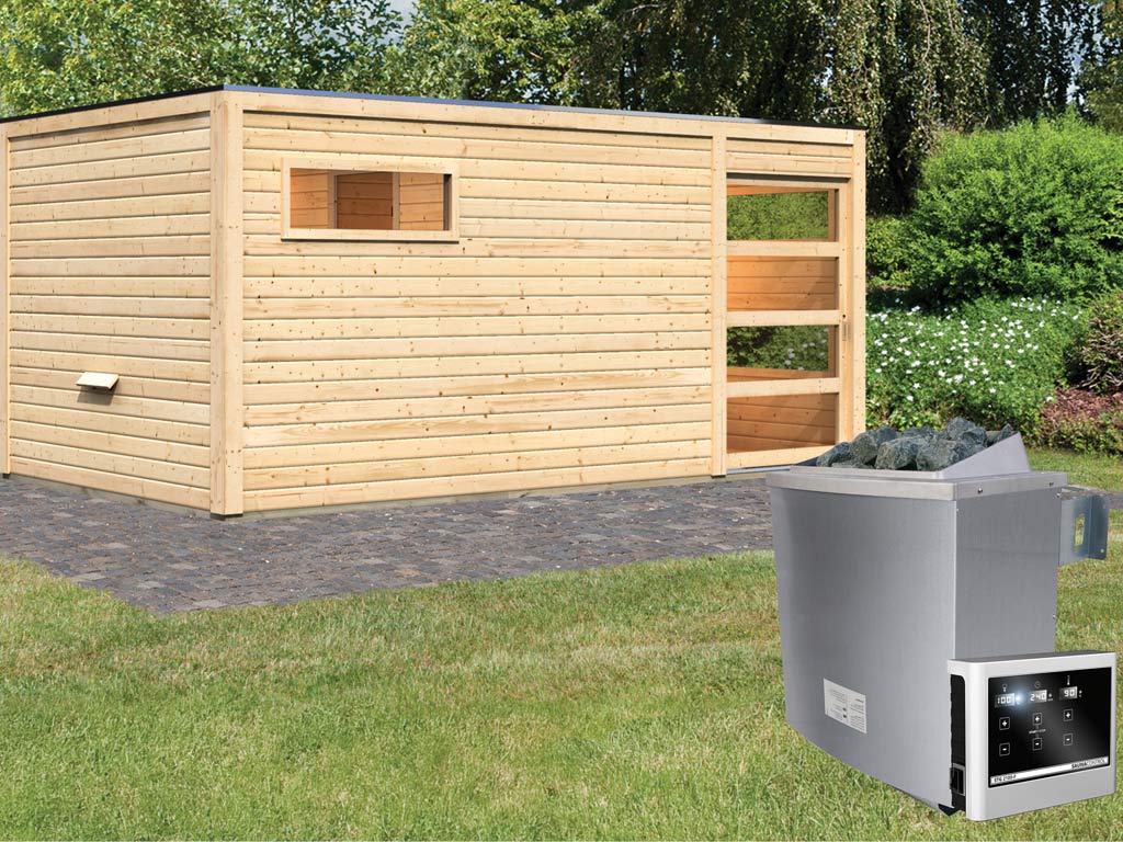 Saunahaus Cuben 38 mm naturbelassen inkl. 9 kW...B x T x H: 276 x 276 x 210 cm, inkl. 3 Liegen, inkl. 9 kW Saunaofen + ext. Steuerung