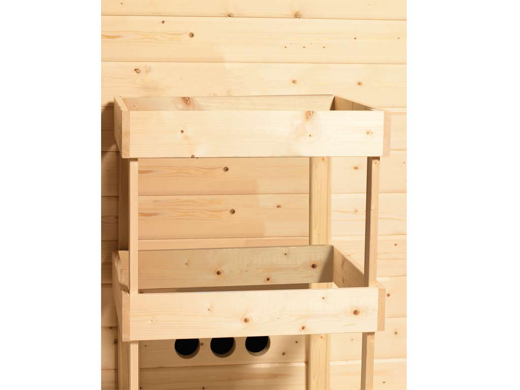 Die drei stabilen Bankliegen aus Espenholz erhöhen den Komfort in diesem Saunahaus. Zusätzlich ist ein Ofenschutzgitter aus massivem Fichtenholz und ein Massivholzboden im Lieferumfang enthalten. Der integrierte Vorraum lässt sich perfekt zum Umziehen oder Abstellen von Sauna-Zubehör verwenden. Die Mineralwolldämmung in der Saunadecke sorgt zusätzlich für einen niedrigen Energieverbrauch. Inklusive Montageanleitung. - Schiebetür