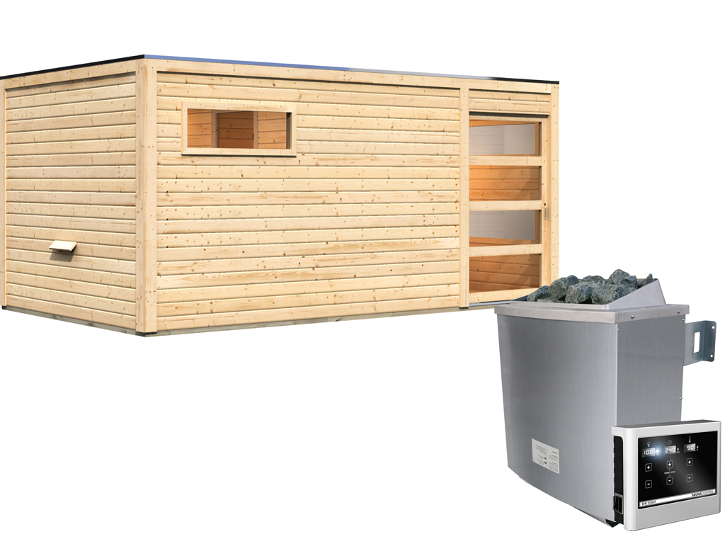 Die 125 cm breite Schiebetür mit seinen 4 Lichtausschnitten in Klarglasoptik ist ein besonderes Highlight. Die Tür ist mit einem Drehriegelschloss mit zwei Schlüsseln ausgestattet und ist links anschlagbar. Die Saunatür besteht aus bronziertem 8 mm Einscheibensicherheitsglas und ist rechts und links anschlagbar. Zur Ausstattung gehören Magnetschnapper und der hochwertige Holztürgriff im Karibu-Design. - Inkl. 9 kW Saunaofen mit externer Steuerung "Easy"