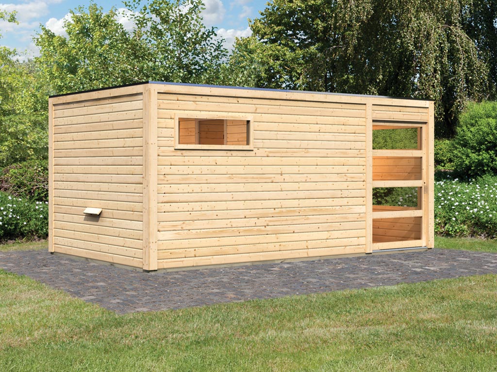 Das Saunahaus bietet genug Platz zum gemeinsamen Saunieren und anschließendem Entspannen im eigenen Garten. Genießen Sie das pure Wellness-Gefühl einfach jederzeit zu Hause im privaten Ambiente. Die Schiebetür und die Fenster lassen viel Licht ins Innere. - Ausstattung